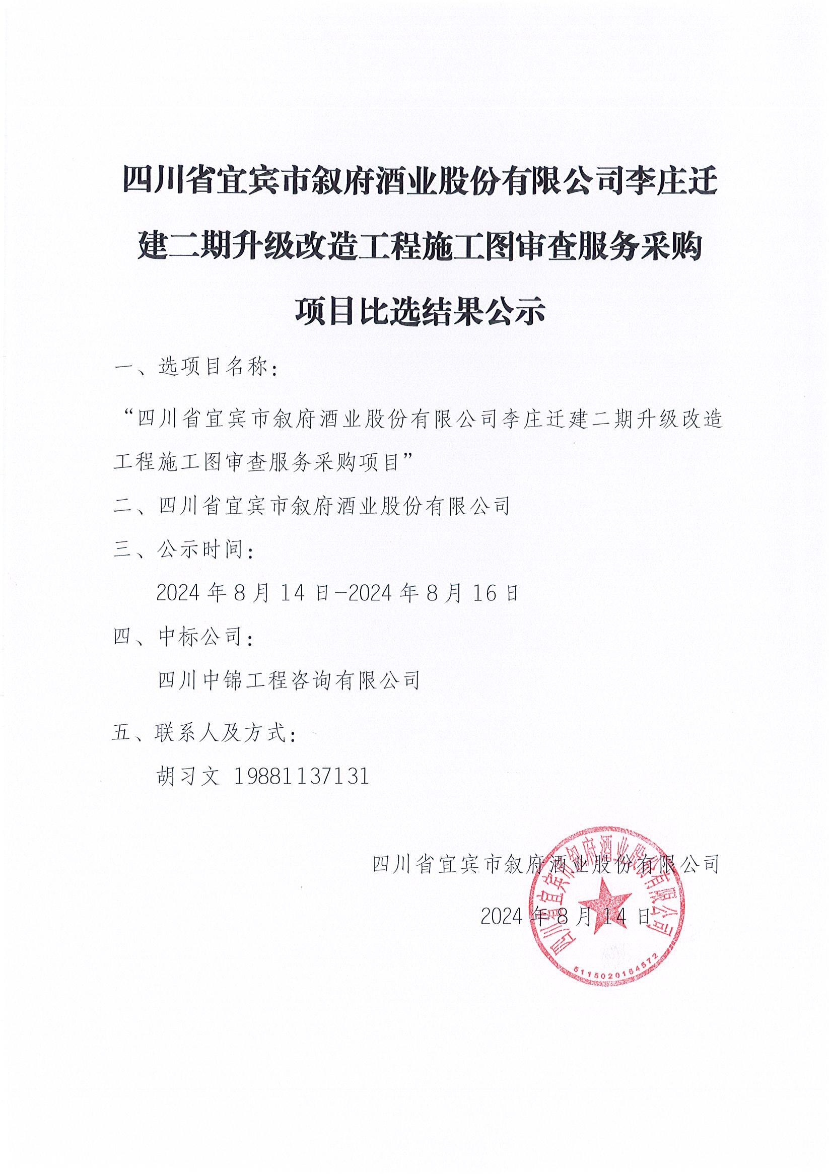 四川省宜賓市敘府酒業(yè)股份有限公司李莊遷建二期升級改造工程施工圖審查服務(wù)采購項目中標結(jié)果公示公告