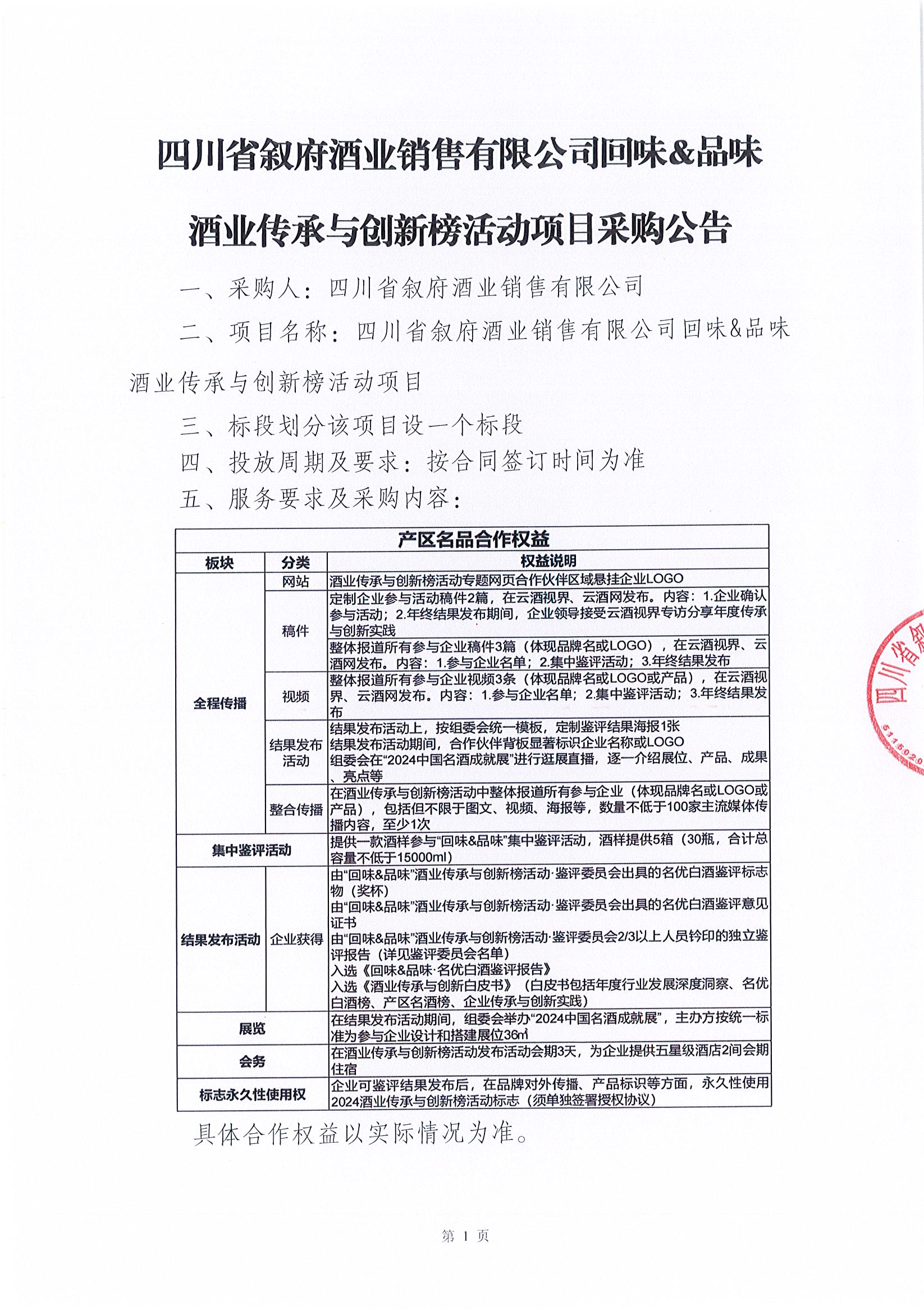 四川省敘府酒業(yè)銷售有限公司回味&品味酒業(yè)傳承與創(chuàng)新榜活動采購項目單一來源采購公告