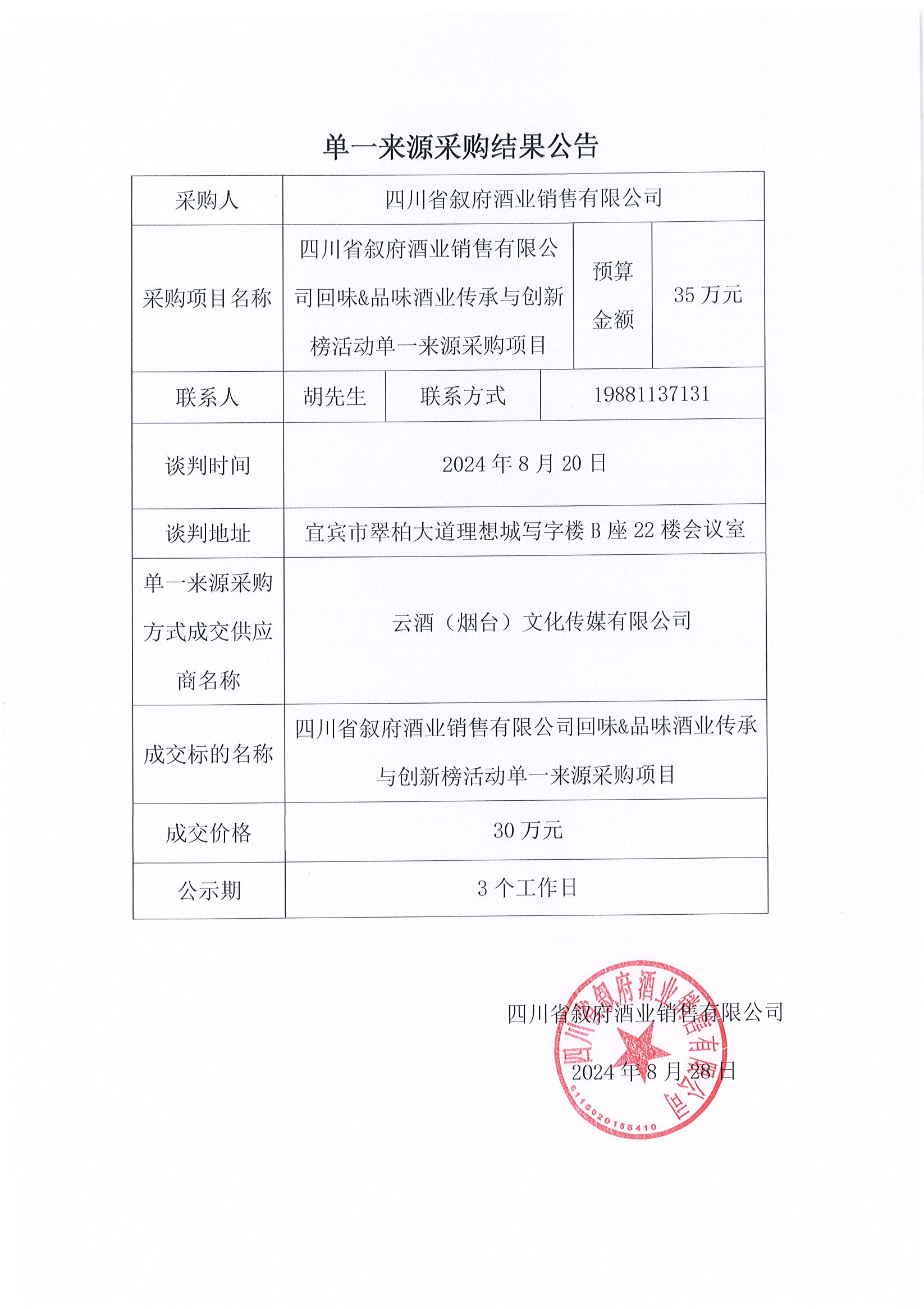四川省敘府酒業(yè)銷售有限公司回味&品味酒業(yè)傳承與創(chuàng)新榜活動單一來源采購項目中標結(jié)果公示公告
