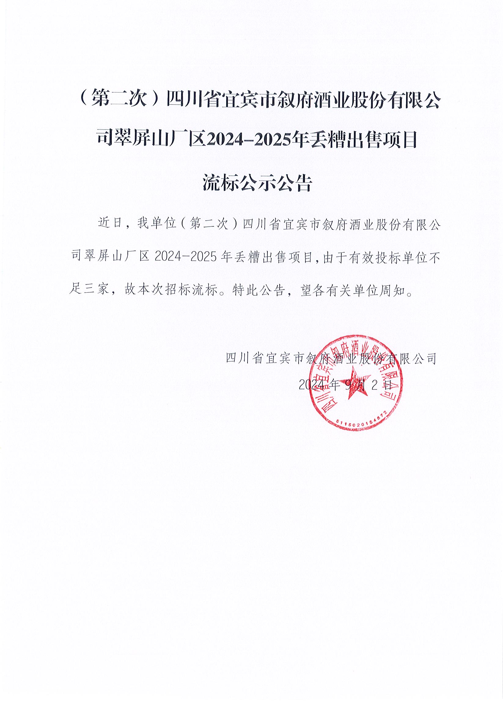 (第二次)四川省宜賓市敘府酒業(yè)股份有限公司翠屏山廠區(qū)2024-2025年丟糟出售項目 流標公示公告