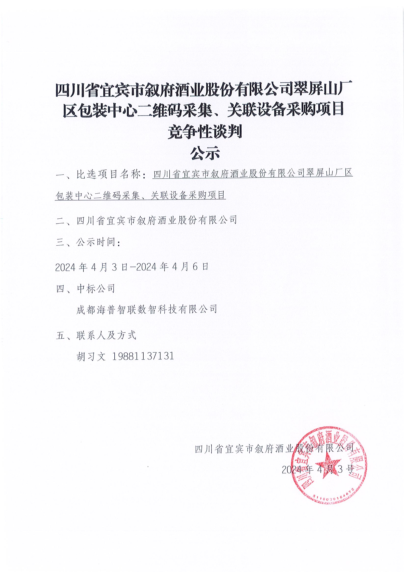 四川省宜賓市敘府酒業(yè)股份有限公司翠屏山廠區(qū)包裝中心二維碼采集、關(guān)聯(lián)設(shè)備采購項(xiàng)目 競爭性談判中標(biāo) 結(jié)果公示