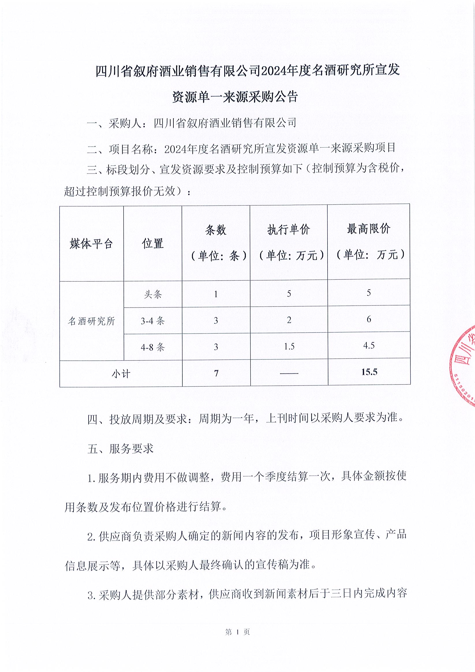 四川省敘府酒業(yè)銷售有限公司2024年度名酒研究所宣發(fā)資源單一來源采購項(xiàng)目公示公告