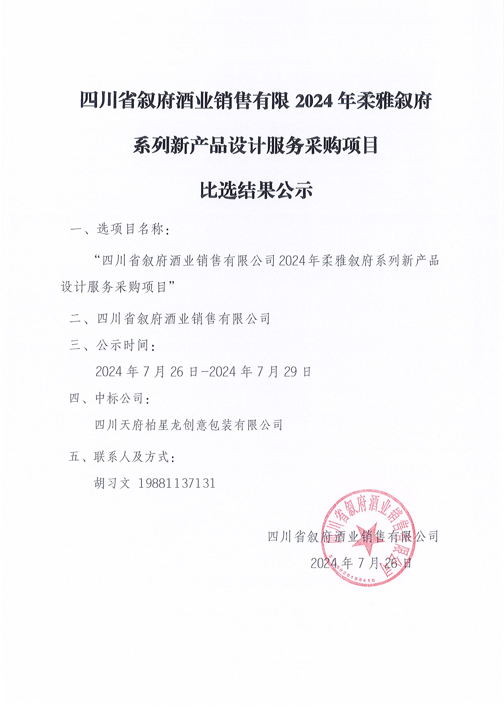 四川省敘府酒業(yè)銷售有限公司 2024年柔雅敘府系列新產(chǎn)品設(shè)計(jì)服務(wù)采購項(xiàng)目比選結(jié)果公示公告