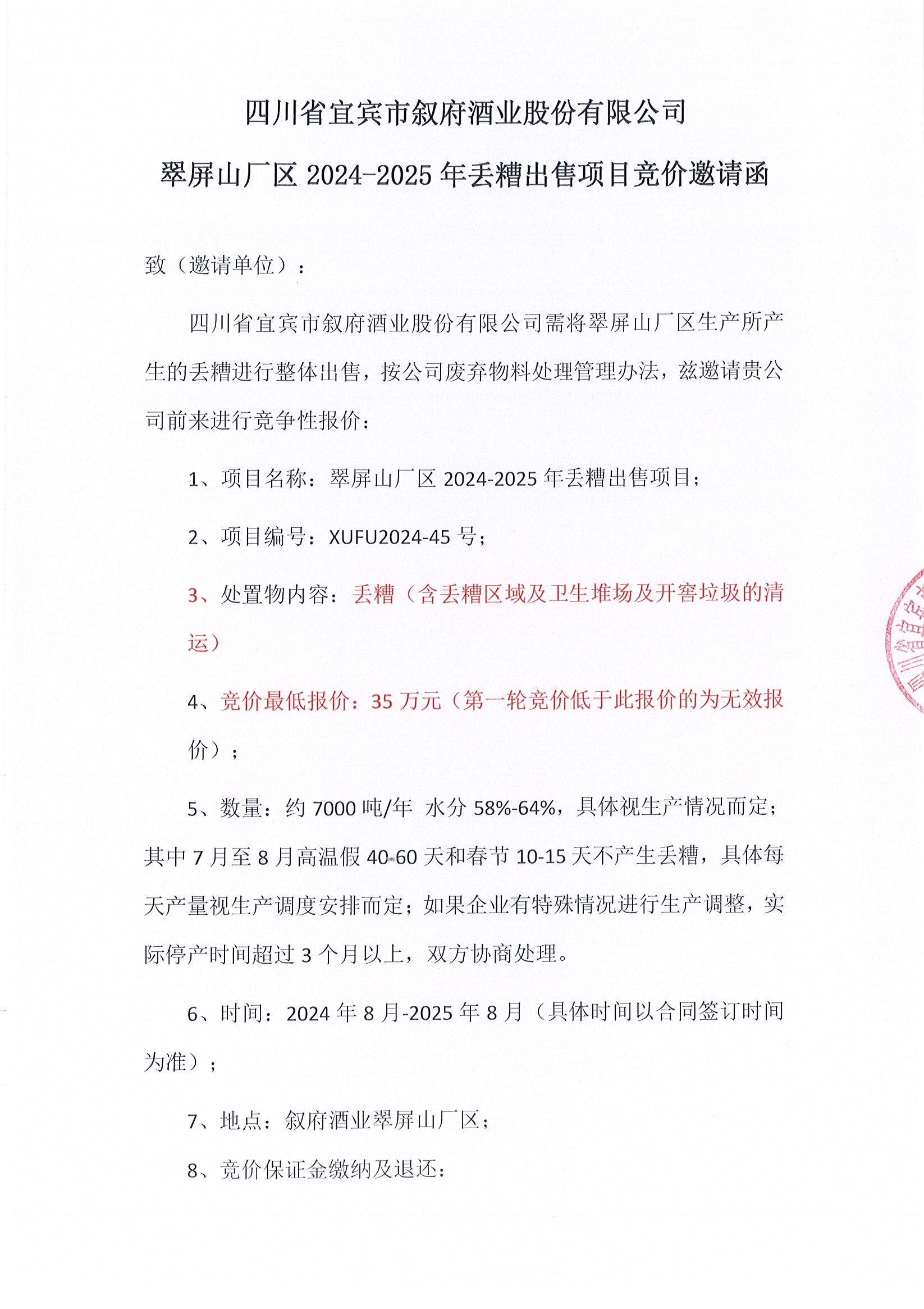 四川省宜賓市敘府酒業(yè)股份有限公司 翠屏山廠區(qū)2024-2025年丟糟出售項(xiàng)目競價(jià)邀請函公示公告