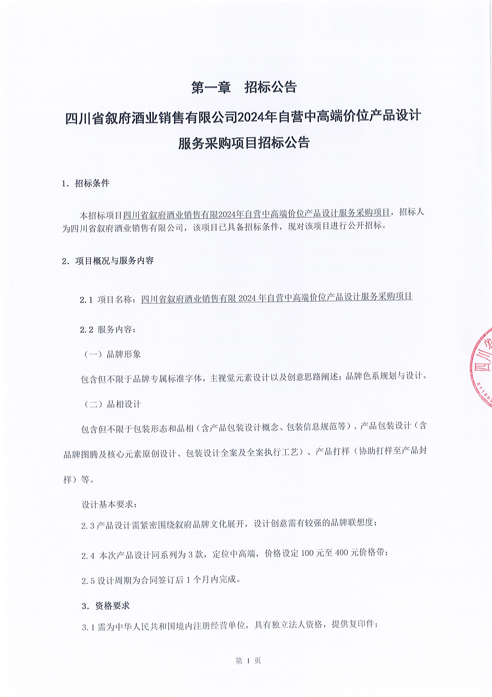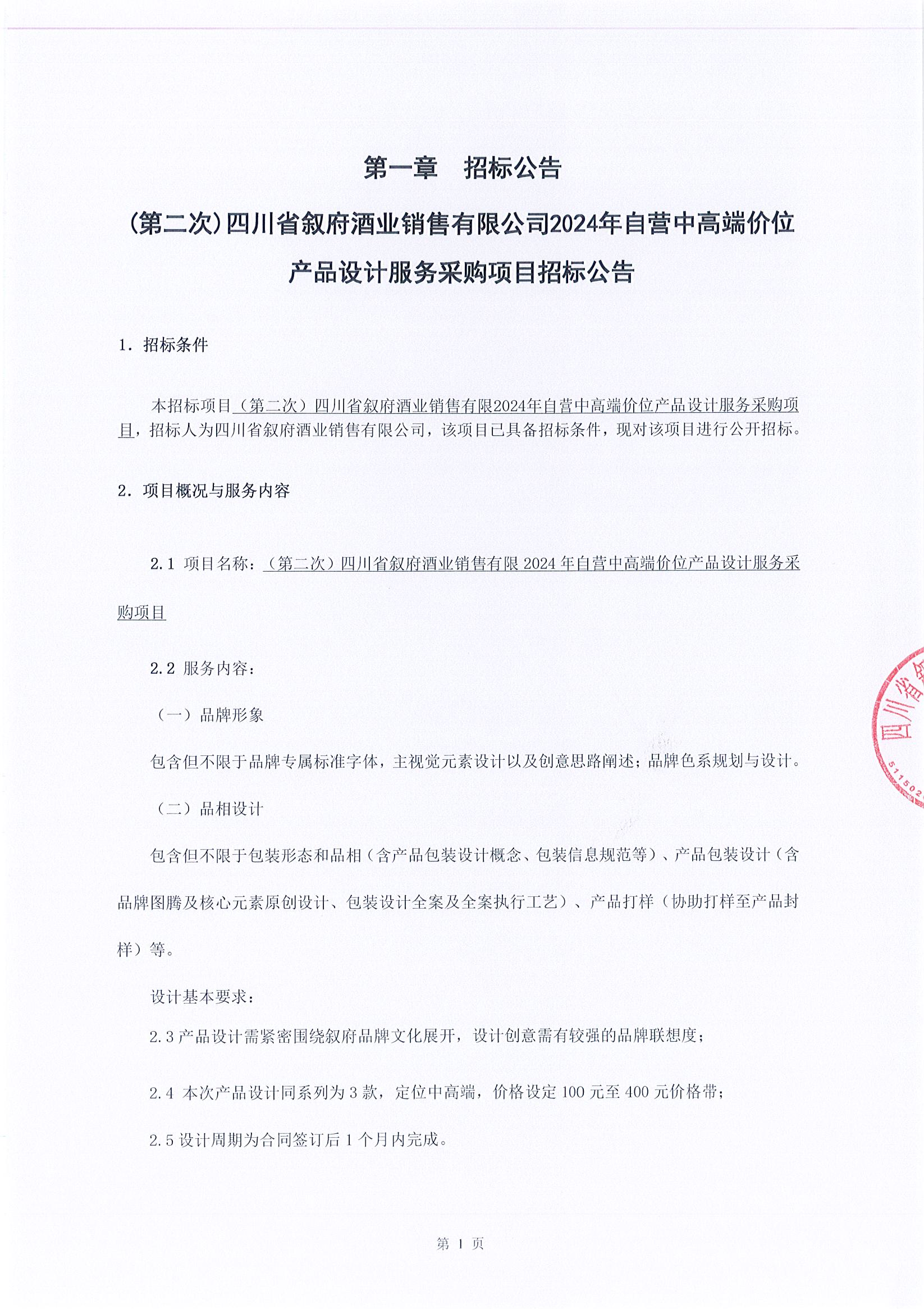 四川省敘府酒業(yè)銷售有限公司 2024年自營中高端價(jià)位產(chǎn)品設(shè)計(jì)服務(wù)采購項(xiàng)目招標(biāo)公告
