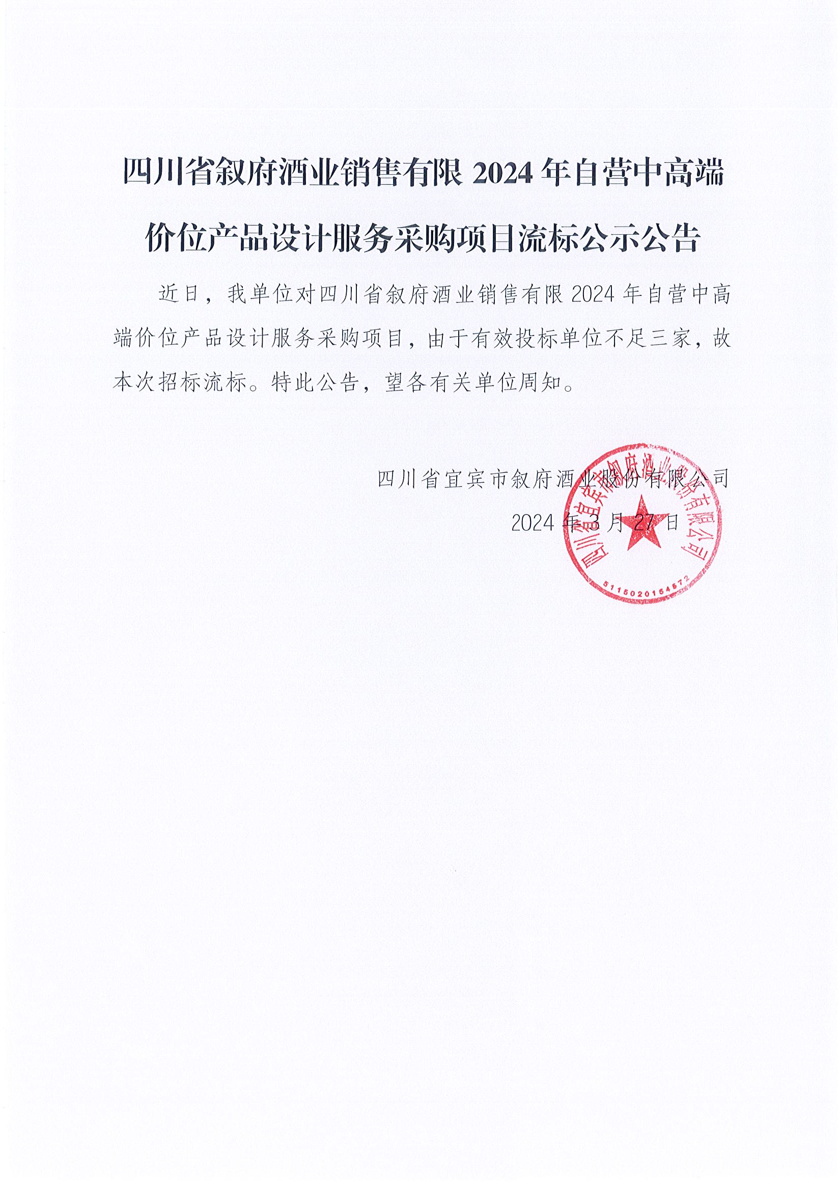 四川省敘府酒業(yè)銷售有限公司 2024年自營中高端價(jià)位產(chǎn)品設(shè)計(jì) 服務(wù)采購項(xiàng)目流標(biāo)公示公告