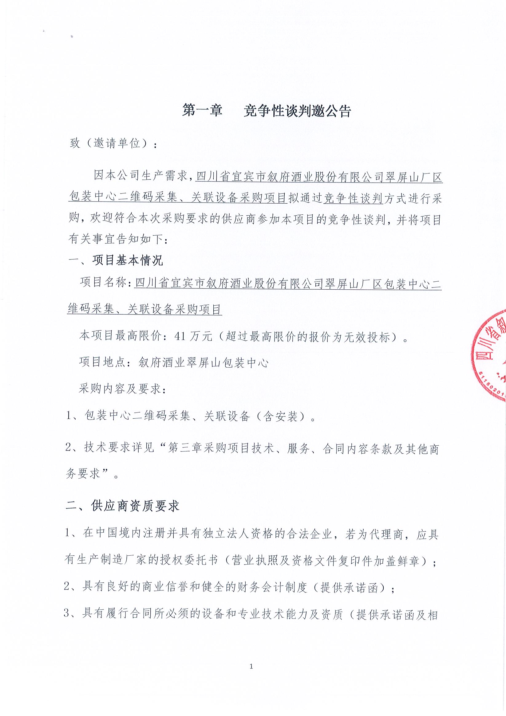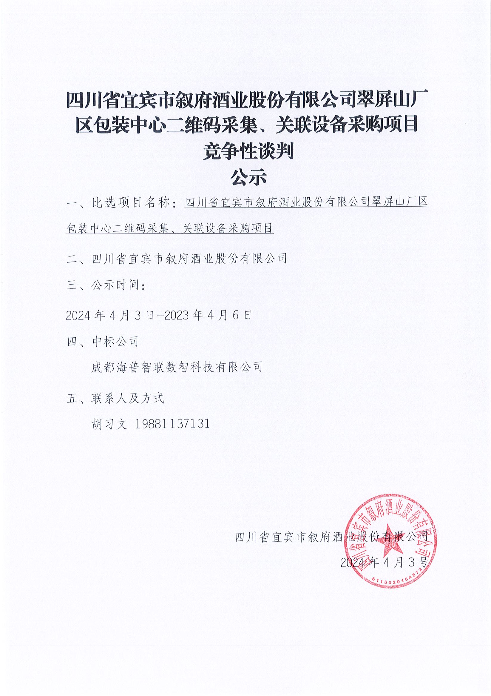 四川省宜賓市敘府酒業(yè)股份有限公司翠屏山廠區(qū)包裝中心二維碼采集、關(guān)聯(lián)設(shè)備采購項(xiàng)目公示公告