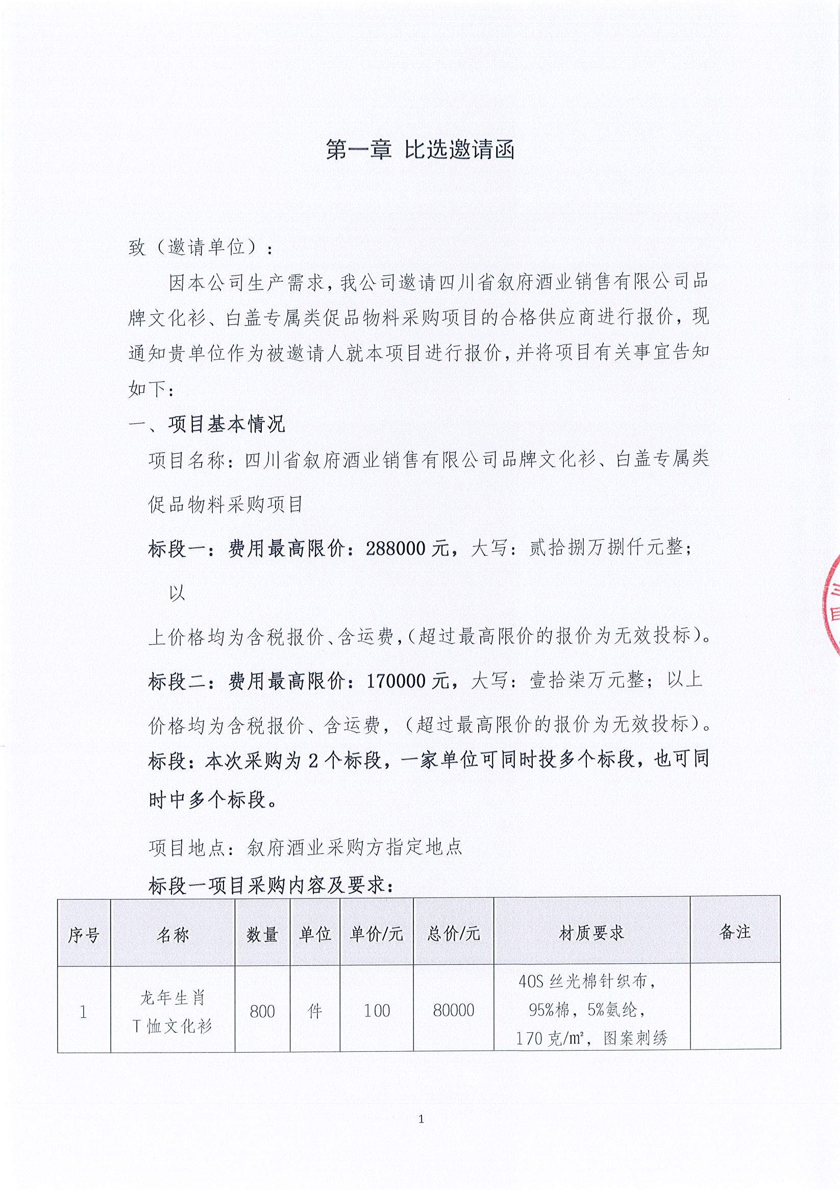 四川省敘府酒業(yè)銷售有限公司品牌文化衫、白蓋專屬類促品物料采購項(xiàng)目比選公告