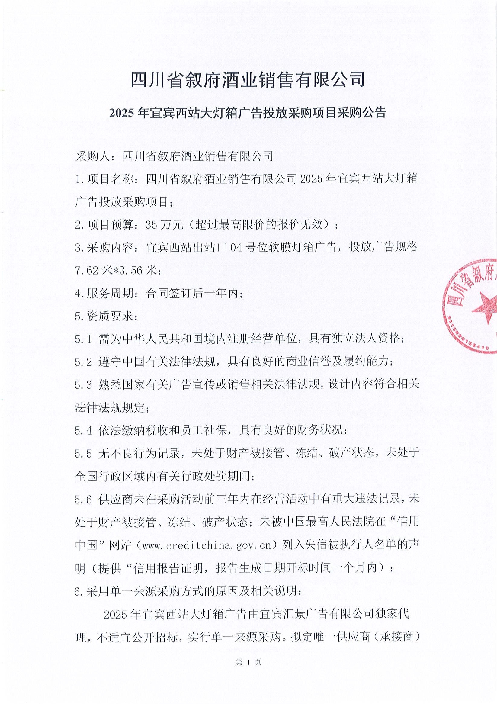 四川省敘府酒業(yè)銷售有限公司2025年宜賓西站大燈箱廣告投放采購項目采購公告