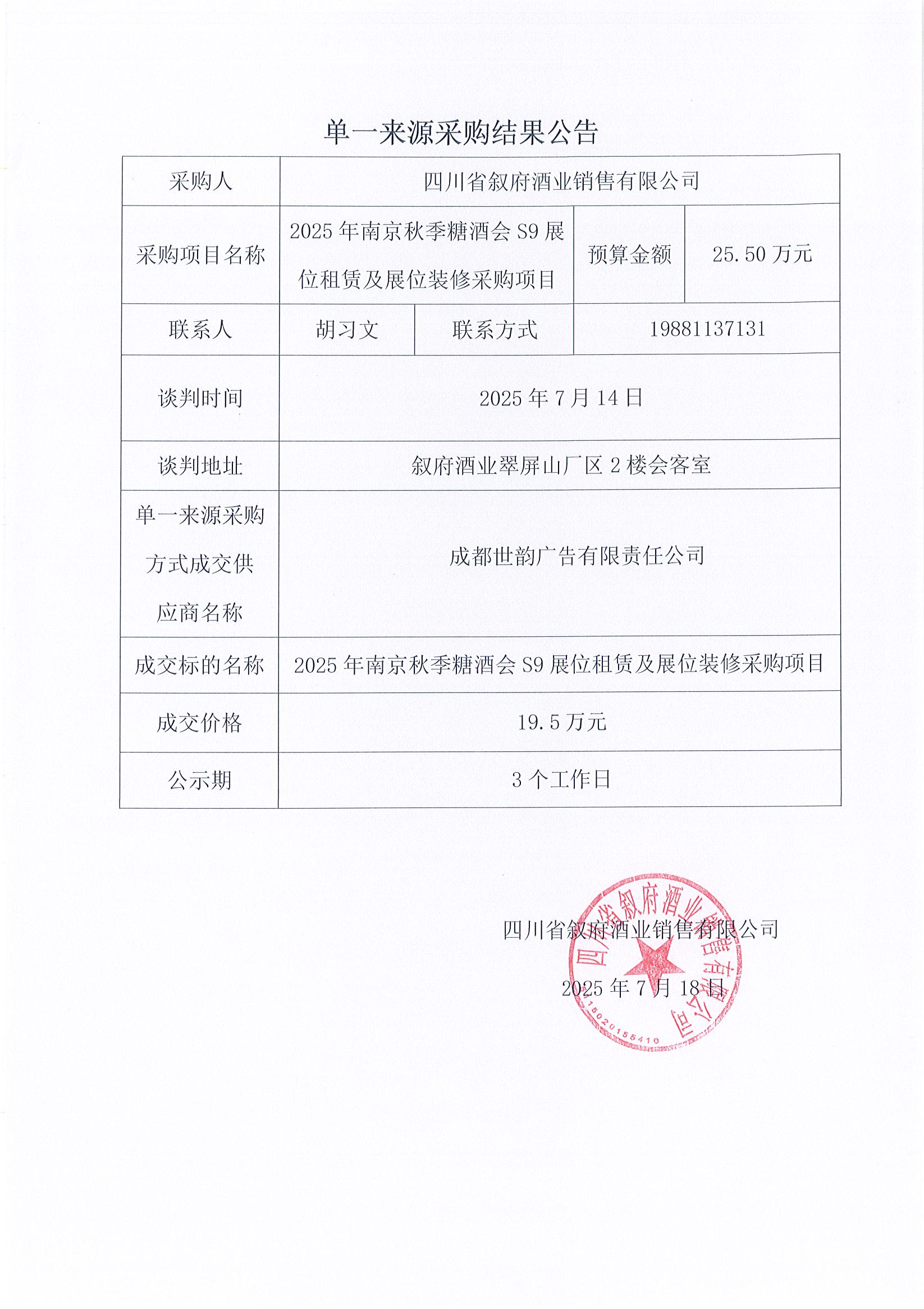 四川省敘府酒業(yè)銷售有限公司2025年南京秋季糖酒會S9展位租賃及展位裝修采購項目結(jié)果公示公告