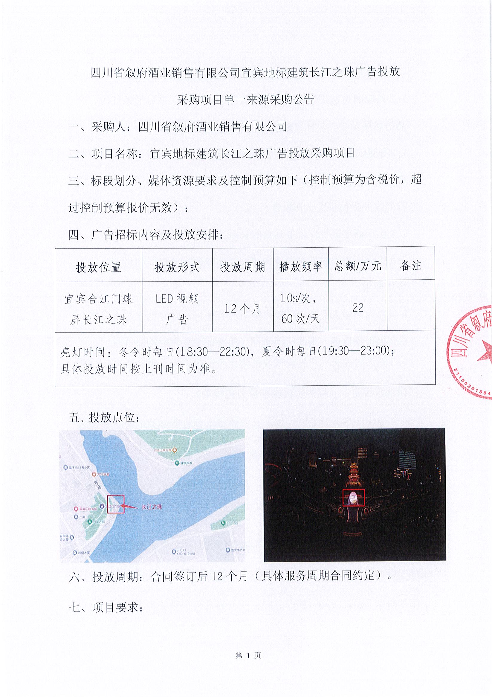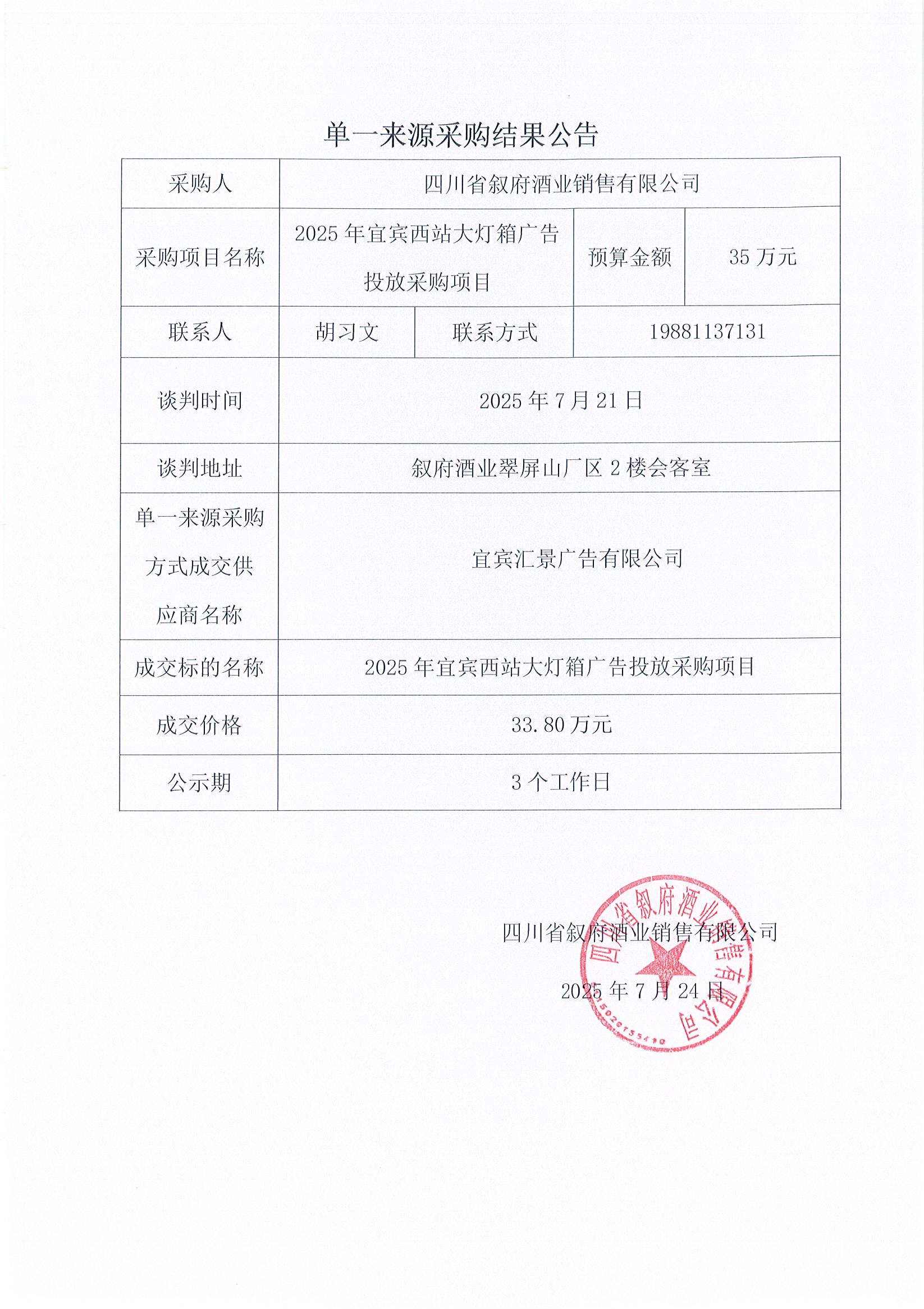 四川省敘府酒業(yè)銷售有限公司2025年宜賓西站大燈箱廣告投放采購項目單一來源采購結(jié)果公示公告