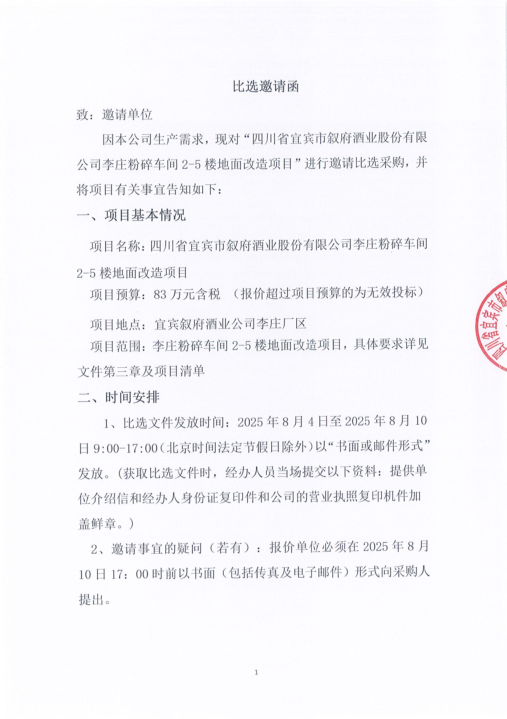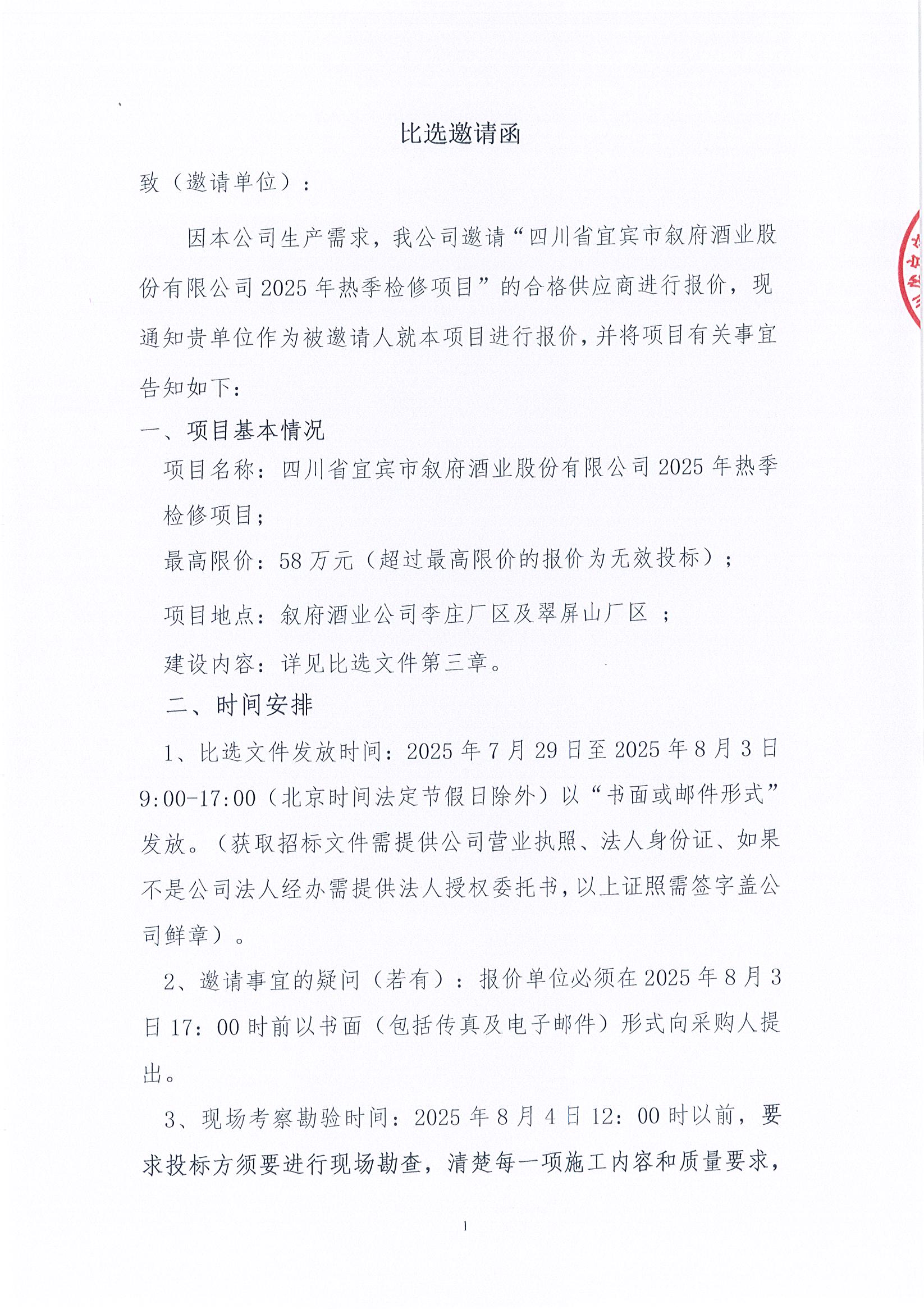 四川省宜賓市敘府酒業(yè)股份有限公司2025年熱季檢修項目公開比選招標(biāo)公告