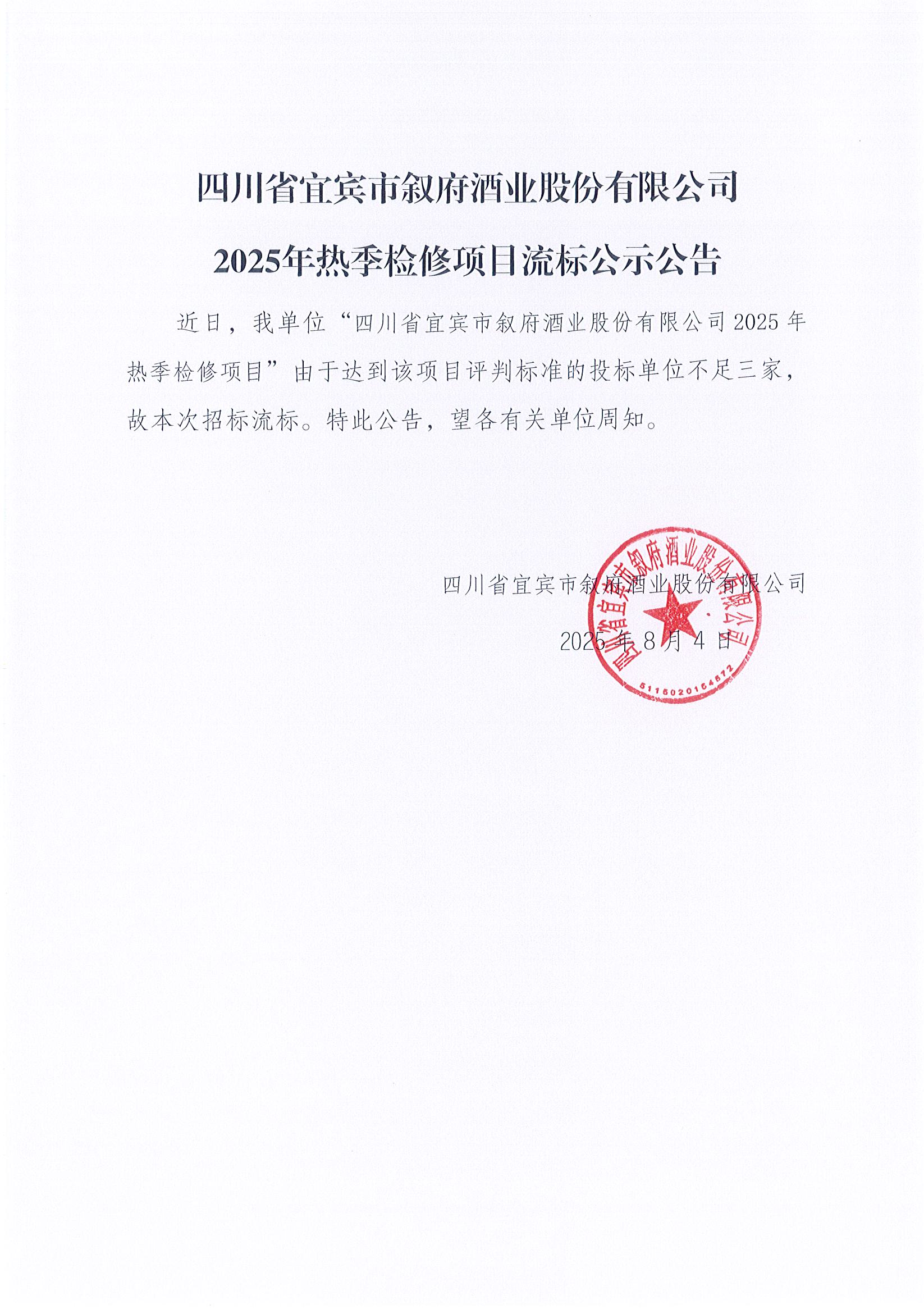 四川省宜賓市敘府酒業(yè)股份有限公司2025年熱季檢修項目流標(biāo)公告