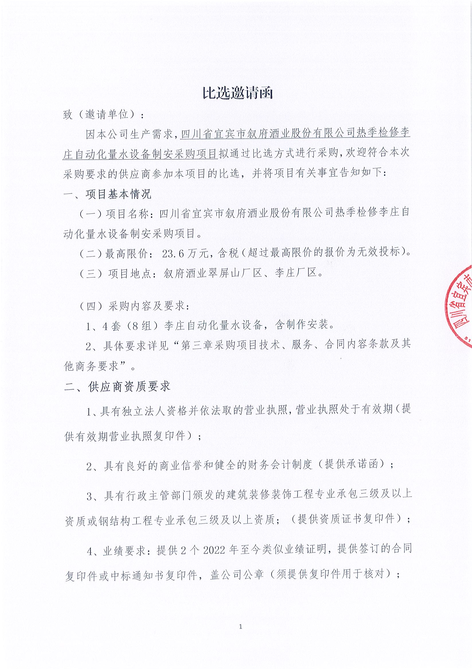 四川省宜賓市敘府酒業(yè)股份有限公司熱季檢修李莊自動化量水設(shè)備制安采購項目招標(biāo)公告