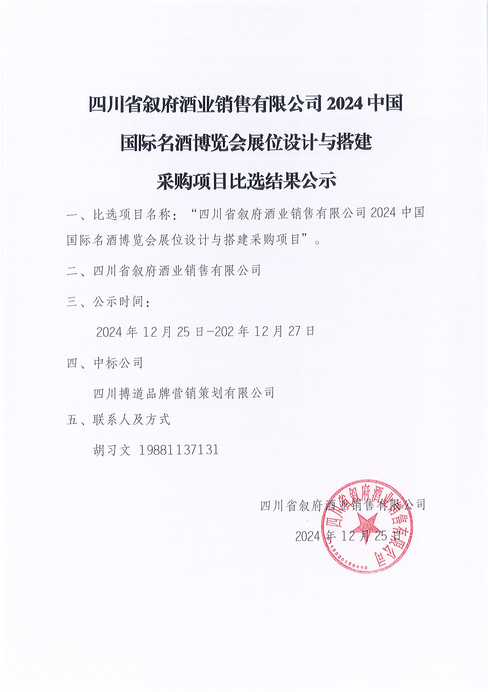 四川省敘府酒業(yè)銷售有限公司2024中國國際名酒博覽會展位設計與搭建采購項目比選結(jié)果公示公告
