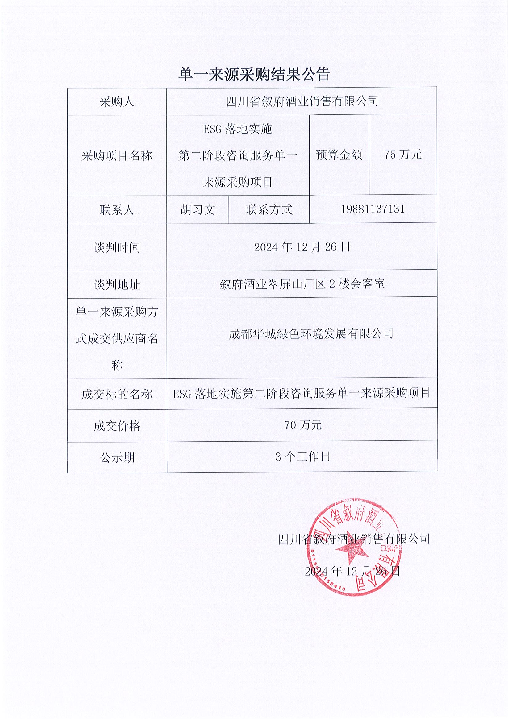 四川省敘府酒業(yè)銷售有限公司ESG落地實施 第二階段咨詢服務單一 來源采購項目結(jié)果公示公告