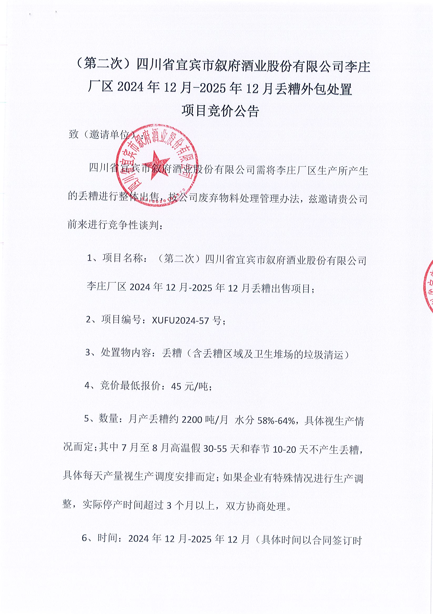 四川省宜賓市敘府酒業(yè)股份有限公司李莊廠區(qū) 2024年12月-2025年12月丟糟外包出售 競爭性談判項(xiàng)目競價(jià)公告