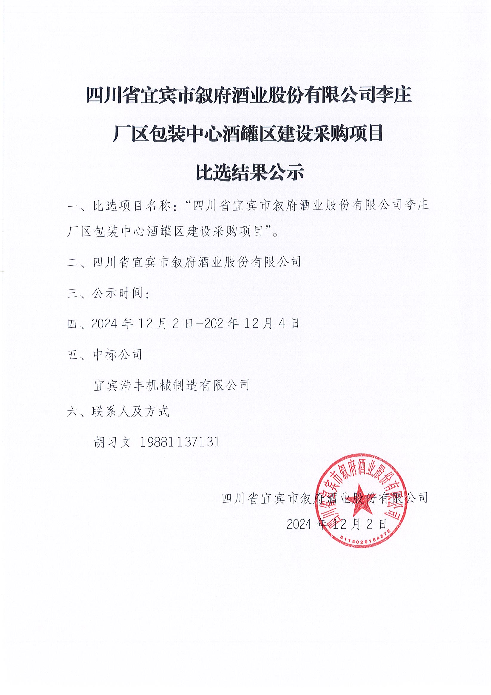 四川省宜賓市敘府酒業(yè)股份有限公司李莊廠區(qū)包裝中心酒罐區(qū)建設(shè)采購項(xiàng)目比選結(jié)果公示