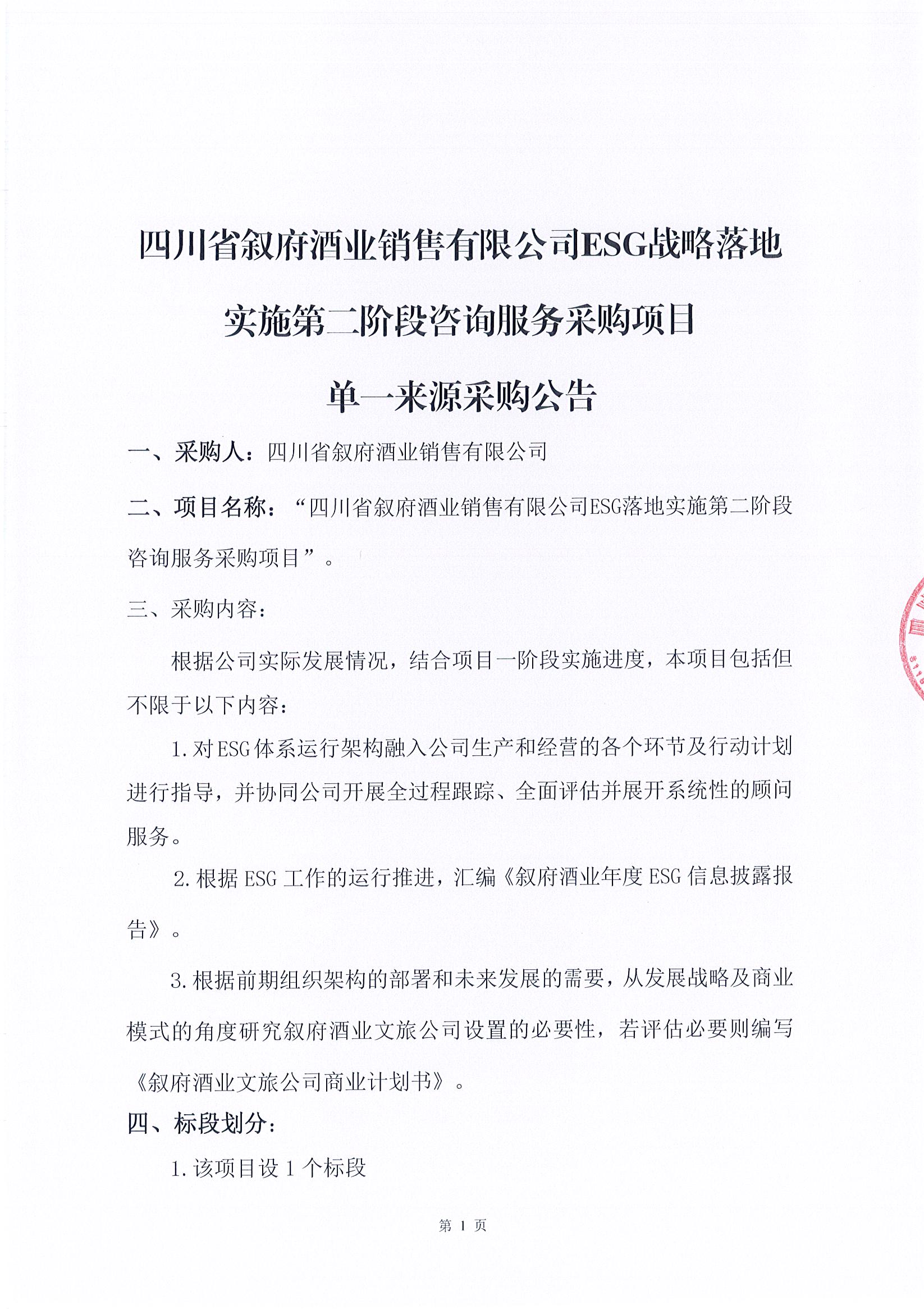 四川省敘府酒業(yè)銷售有限公司ESG落地實(shí)施第二階段咨詢服務(wù)采購項(xiàng)目單一來源公示公告