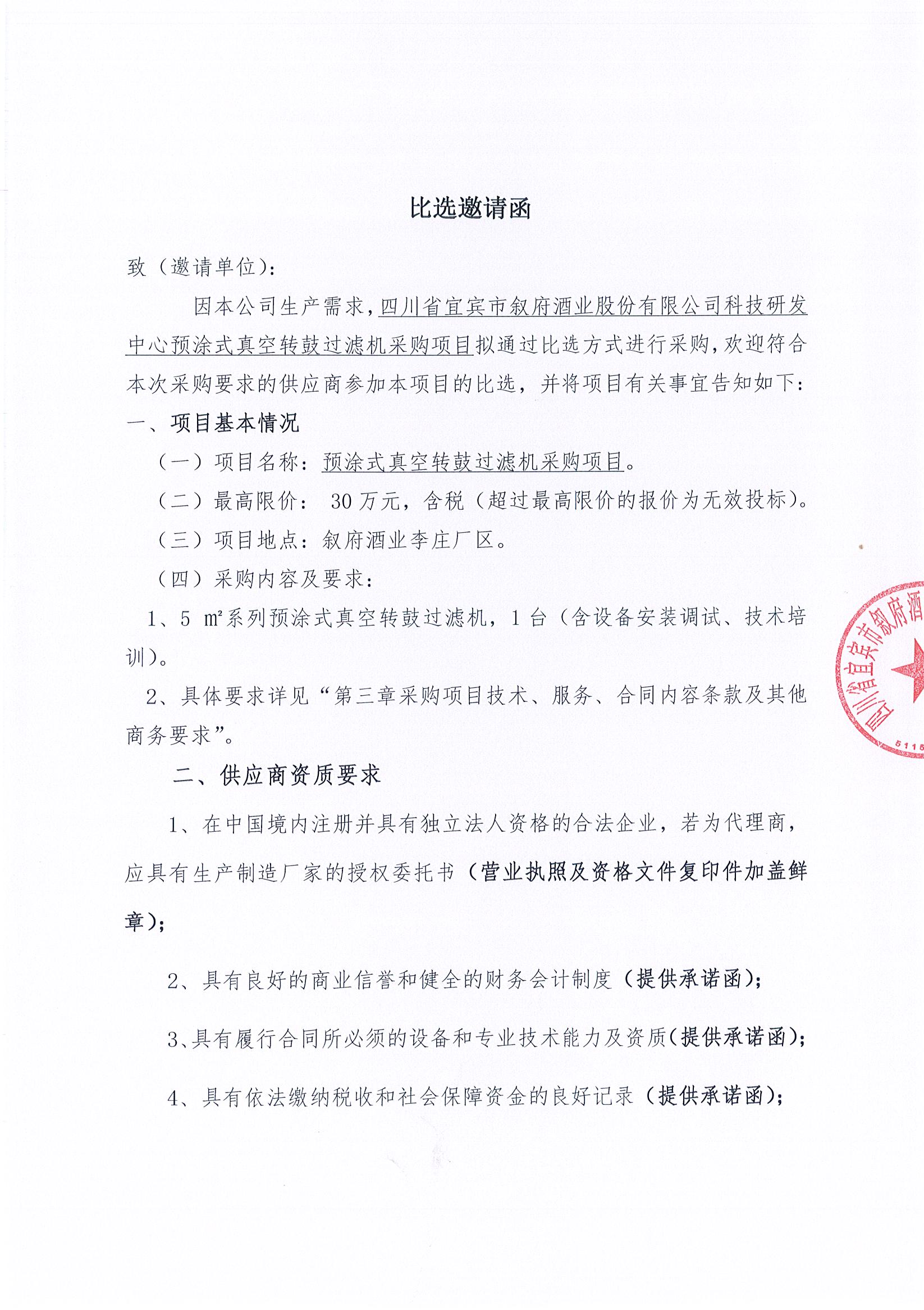 四川省敘府酒業(yè)銷售有限公司2024中國國際名酒博覽會(huì)展位設(shè)計(jì)與搭建采購項(xiàng)目比選公示公告四川省宜賓市敘府酒業(yè)股份有限公司科技研發(fā)中心預(yù)涂式真空轉(zhuǎn)鼓過濾機(jī)采購項(xiàng)目比選公示公告