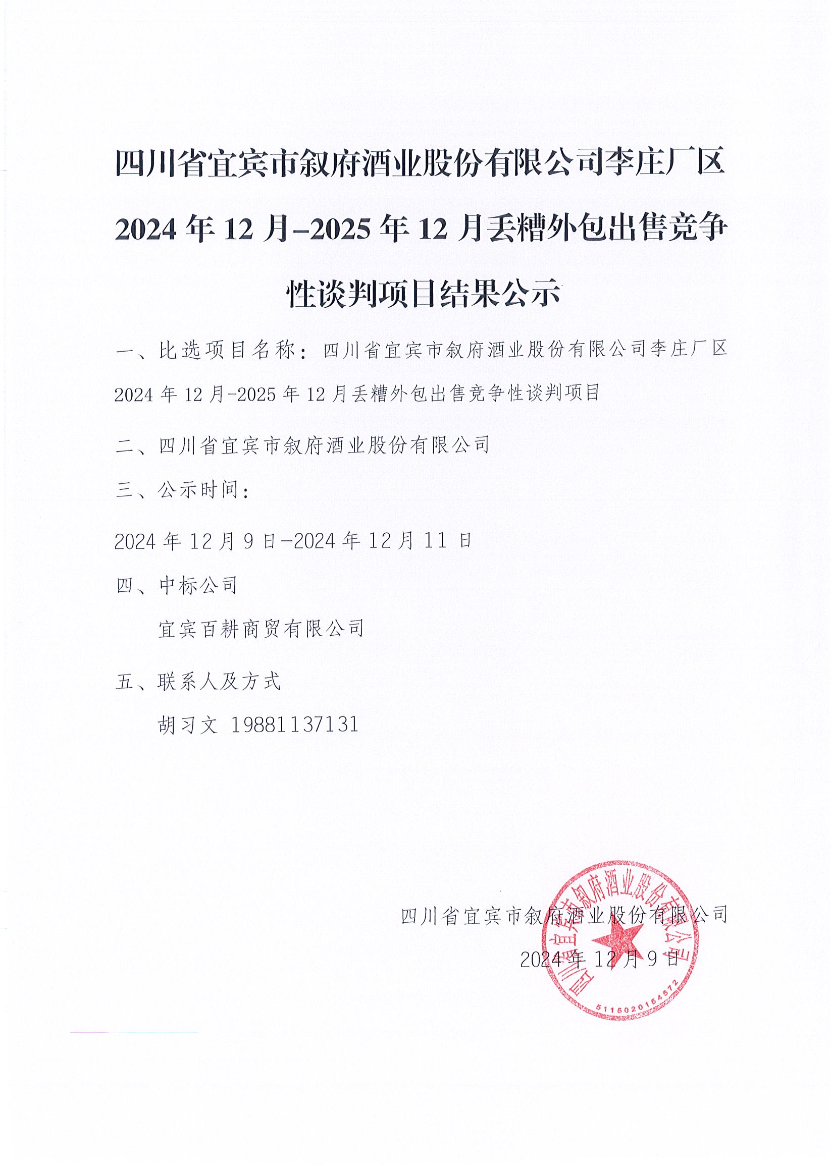 四川省宜賓市敘府酒業(yè)股份有限公司李莊廠區(qū)2024年12月-2025年12月丟糟外包出售競爭性談判項(xiàng)目結(jié)果公示