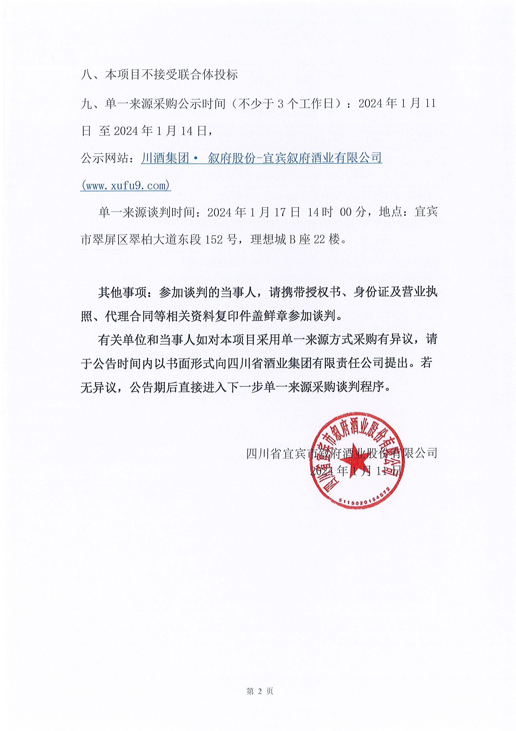 四川省宜賓市敘府酒業(yè)股份有限公司 2024年春季糖酒會(成都泰合國際大飯店)場地租賃公示公告