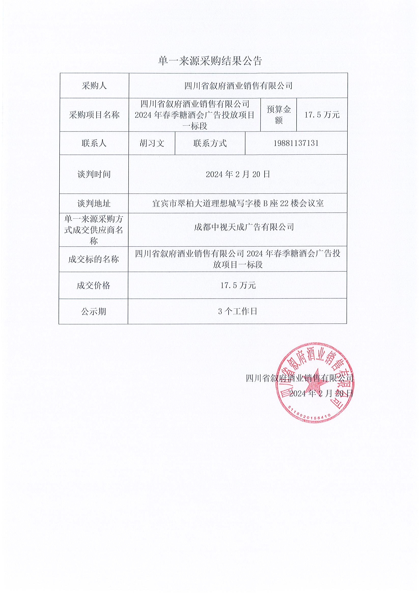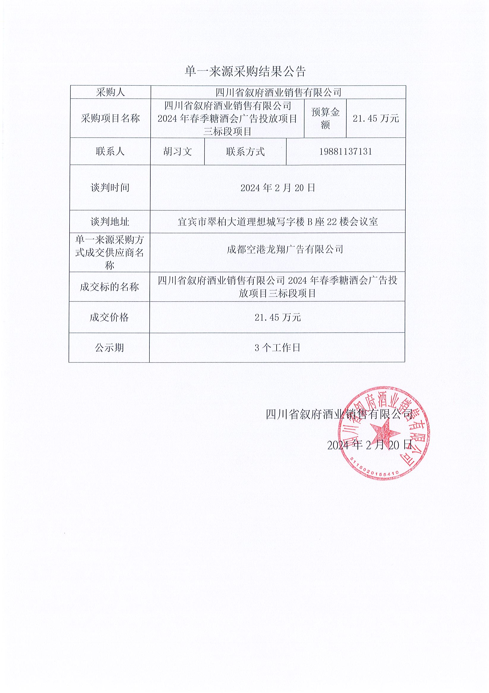四川省敘府酒業(yè)銷(xiāo)售有限公司敘府大曲(藍(lán)標(biāo))產(chǎn)品TVC的創(chuàng)作與拍攝采購(gòu)項(xiàng)目中標(biāo)結(jié)果公示公告