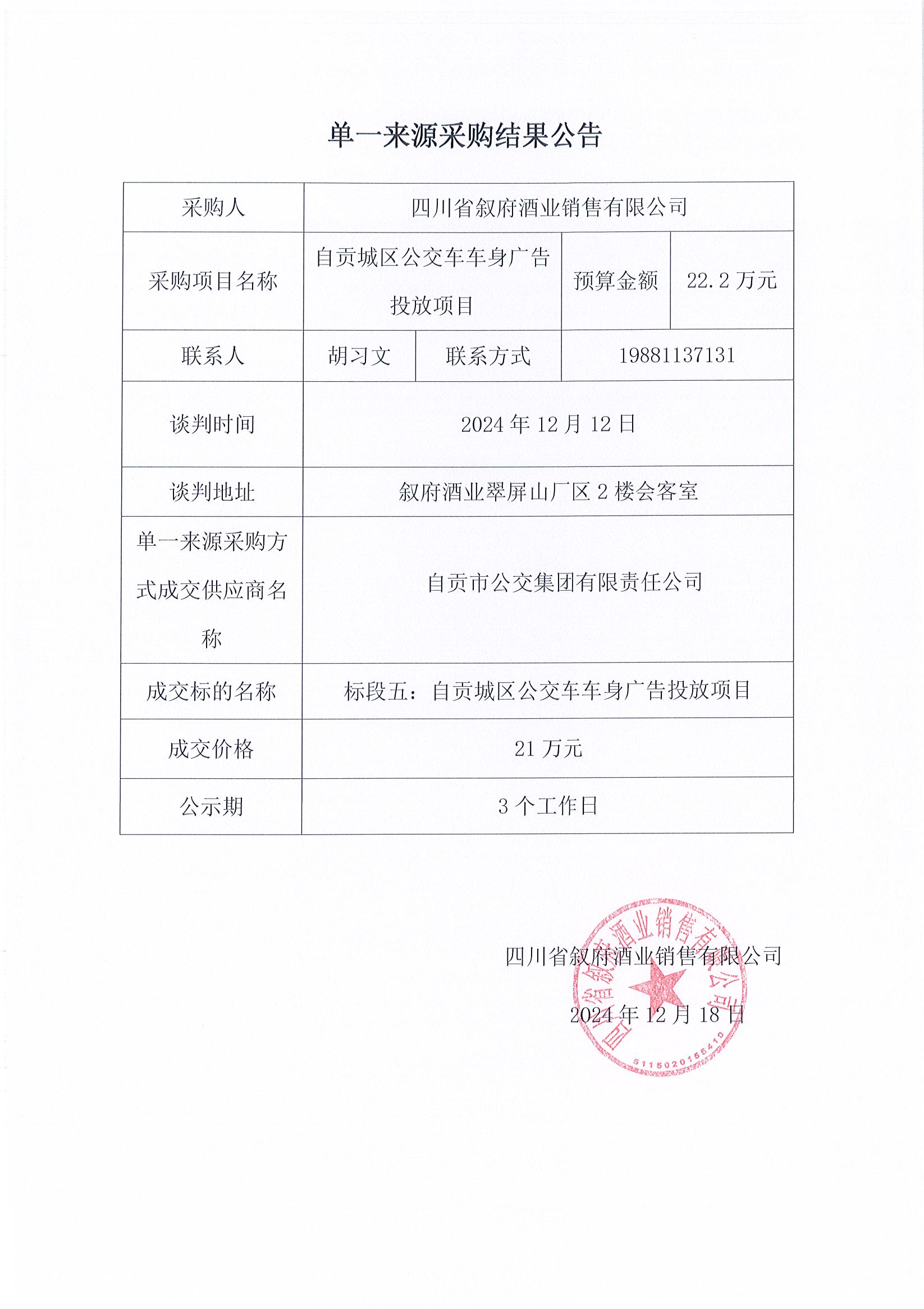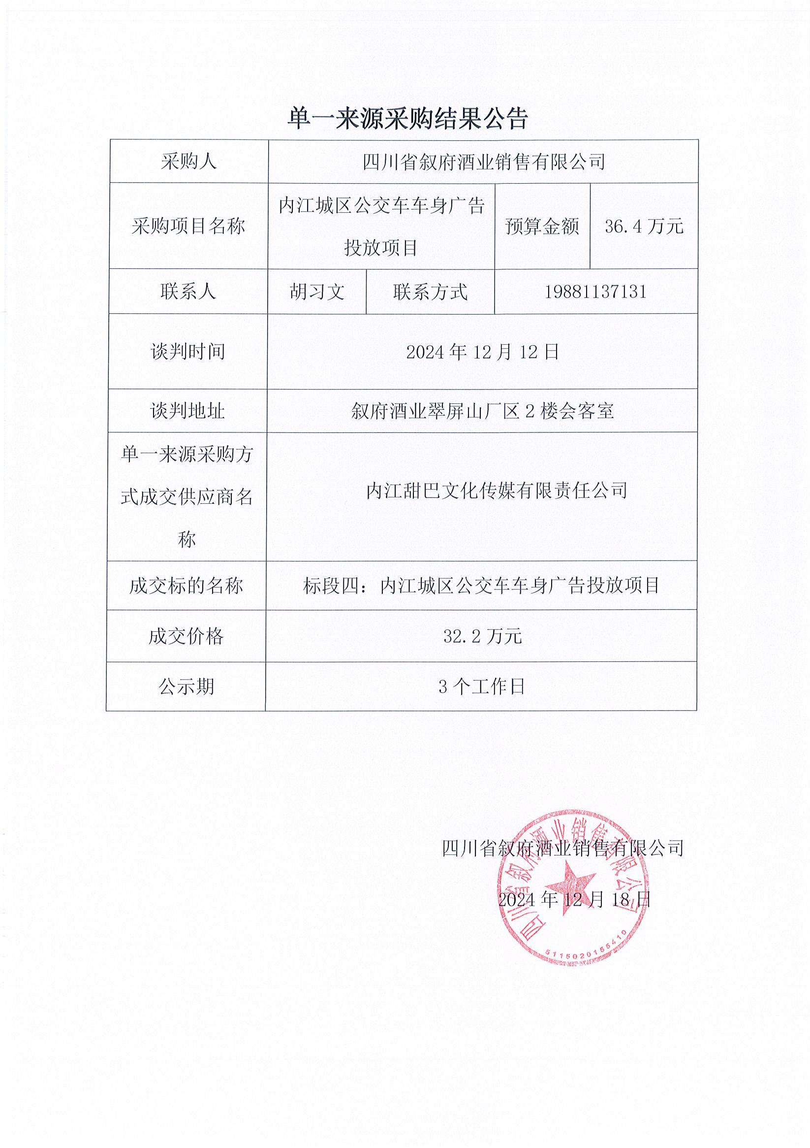 四川省敘府酒業(yè)銷售有限公司敘府大曲(藍標)產品TVC的創(chuàng)作與拍攝采購項目中標結果公示公告