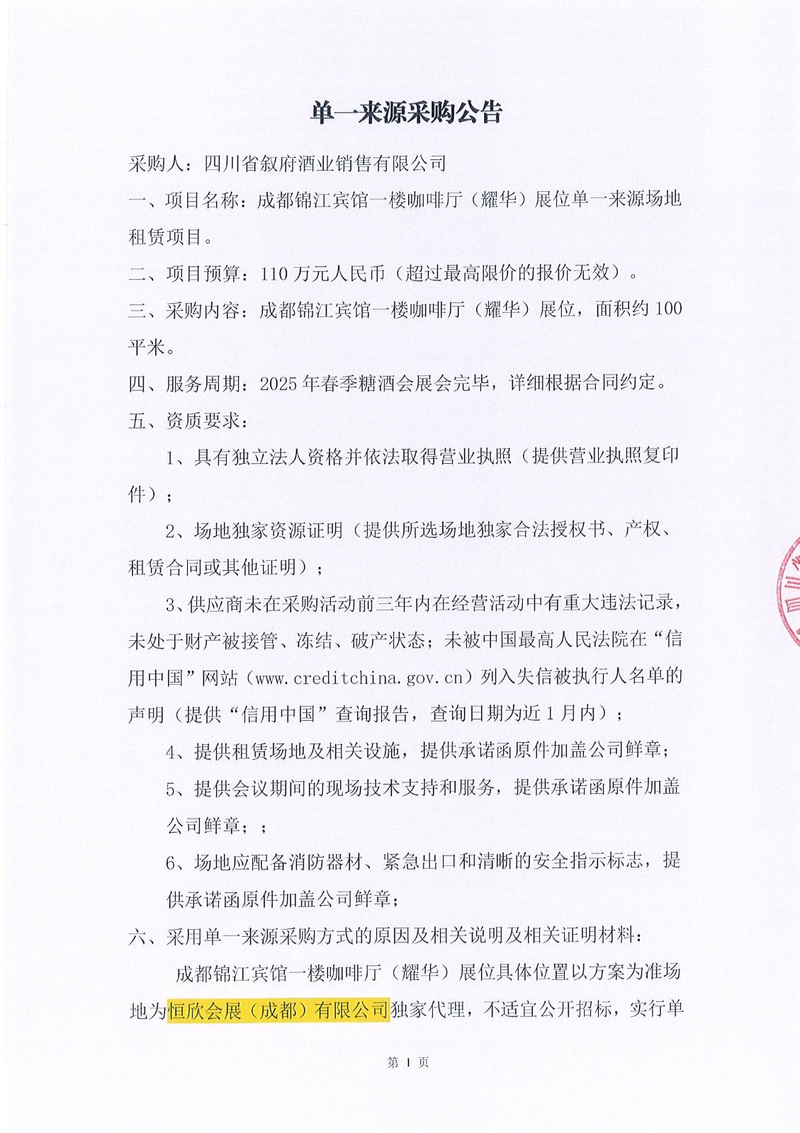 四川省敘府酒業(yè)銷售有限公司2025年春季糖酒會(huì)場(chǎng)地設(shè)計(jì)與制作搭建采購項(xiàng)目比選公示公告
