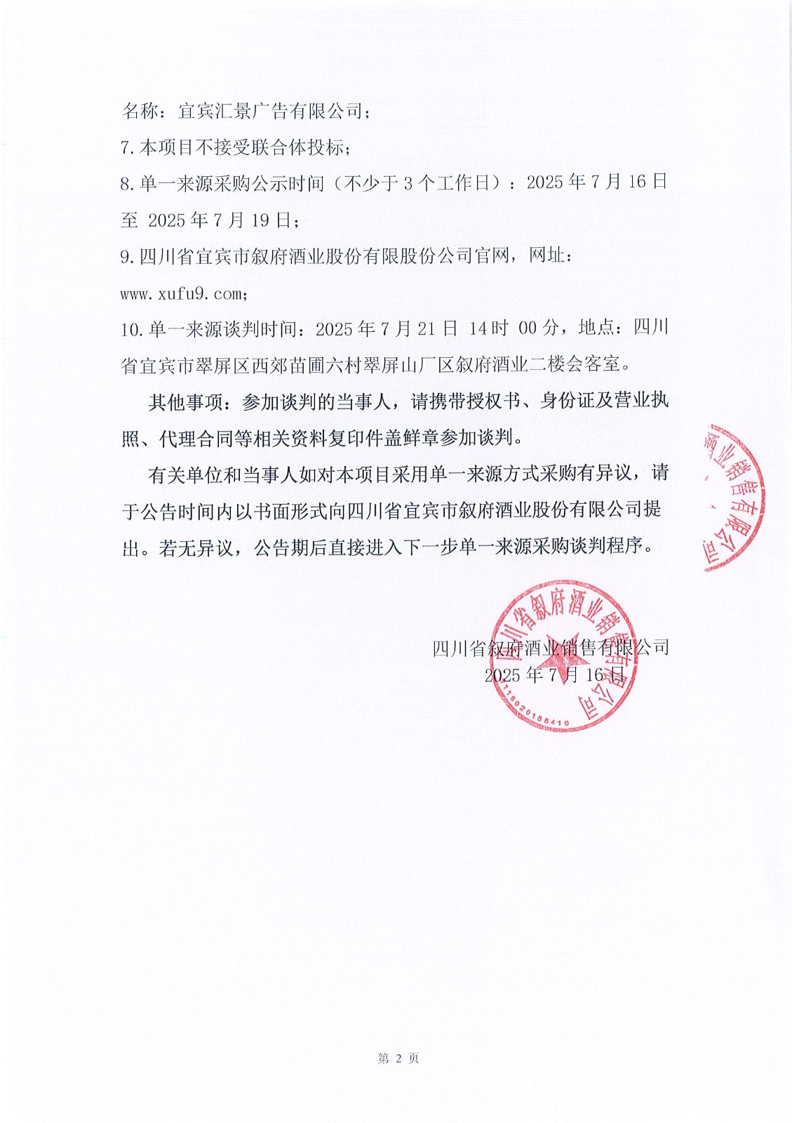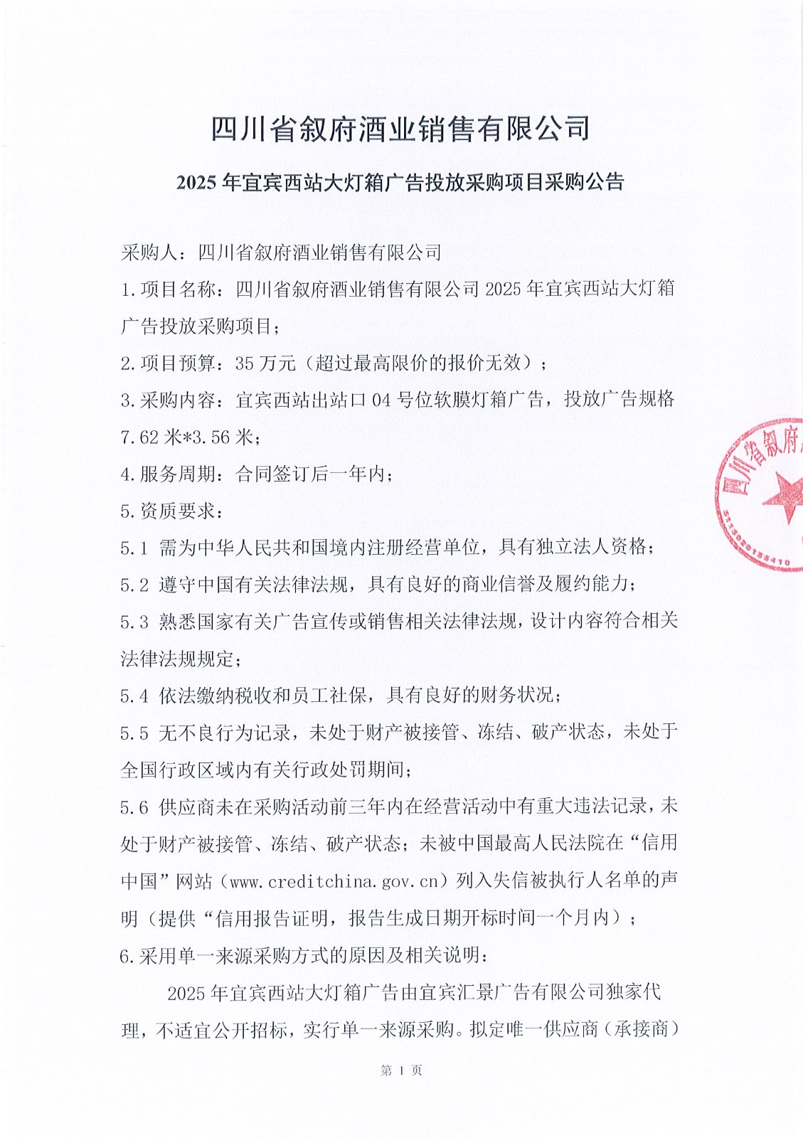 四川省敘府酒業(yè)銷售有限公司2025年宜賓西站大燈箱廣告投放采購項目采購公告