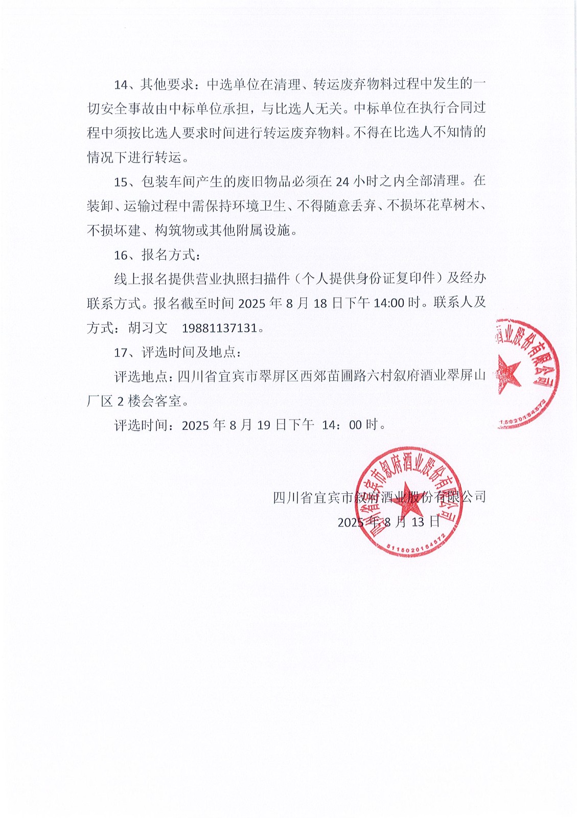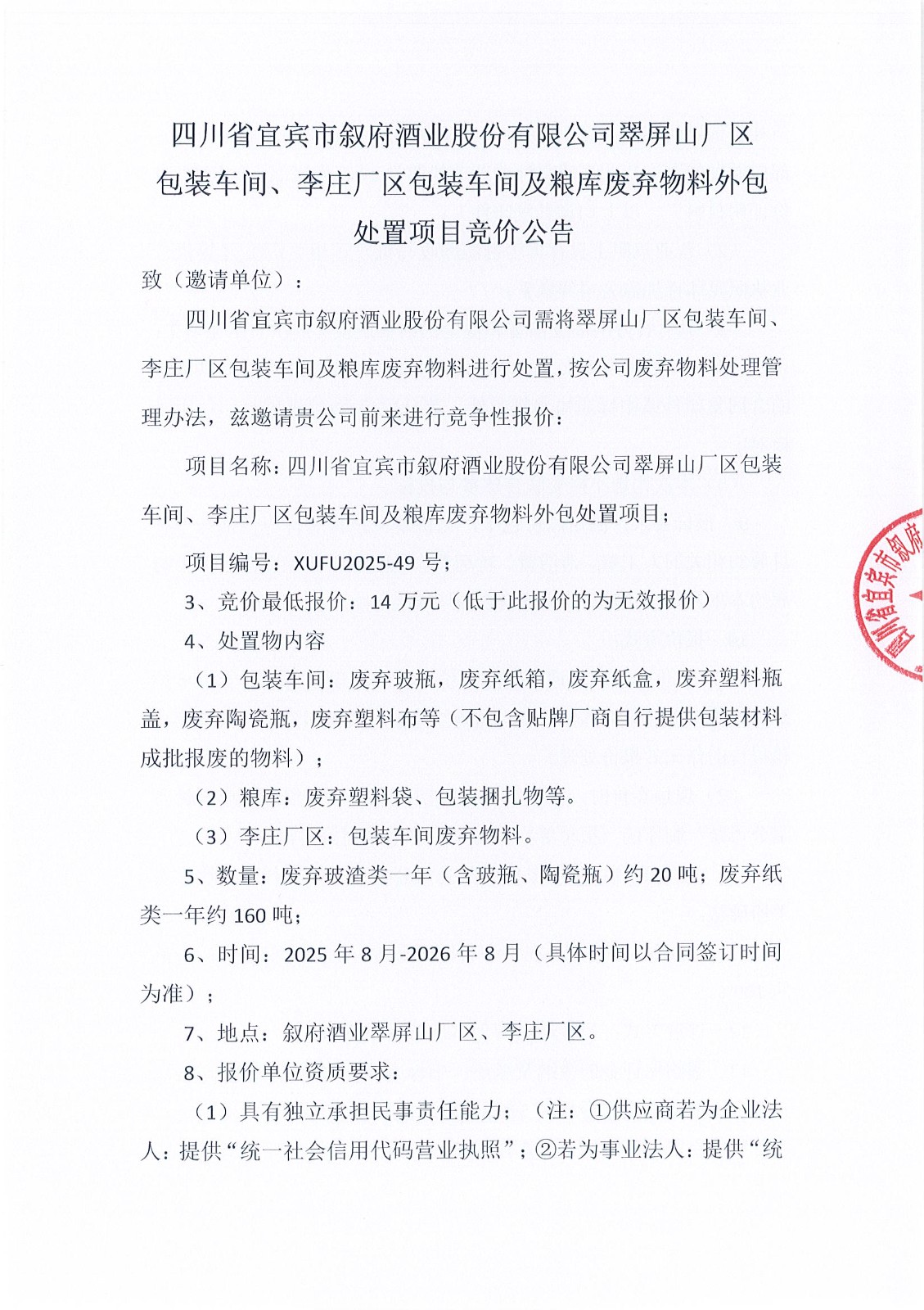 第二次四川省宜賓市敘府酒業(yè)股份有限公司熱季檢修李莊自動化量水設備制安采購項目