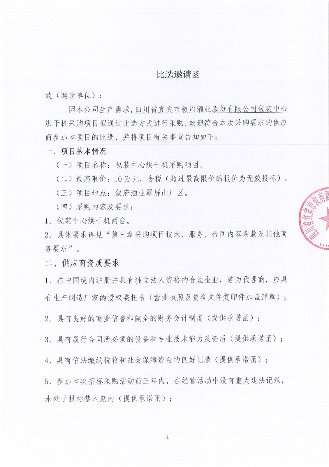 四川省宜賓市敘府酒業(yè)股份有限公司包裝中心烘干機(jī)采購項(xiàng)目流標(biāo)公示公告