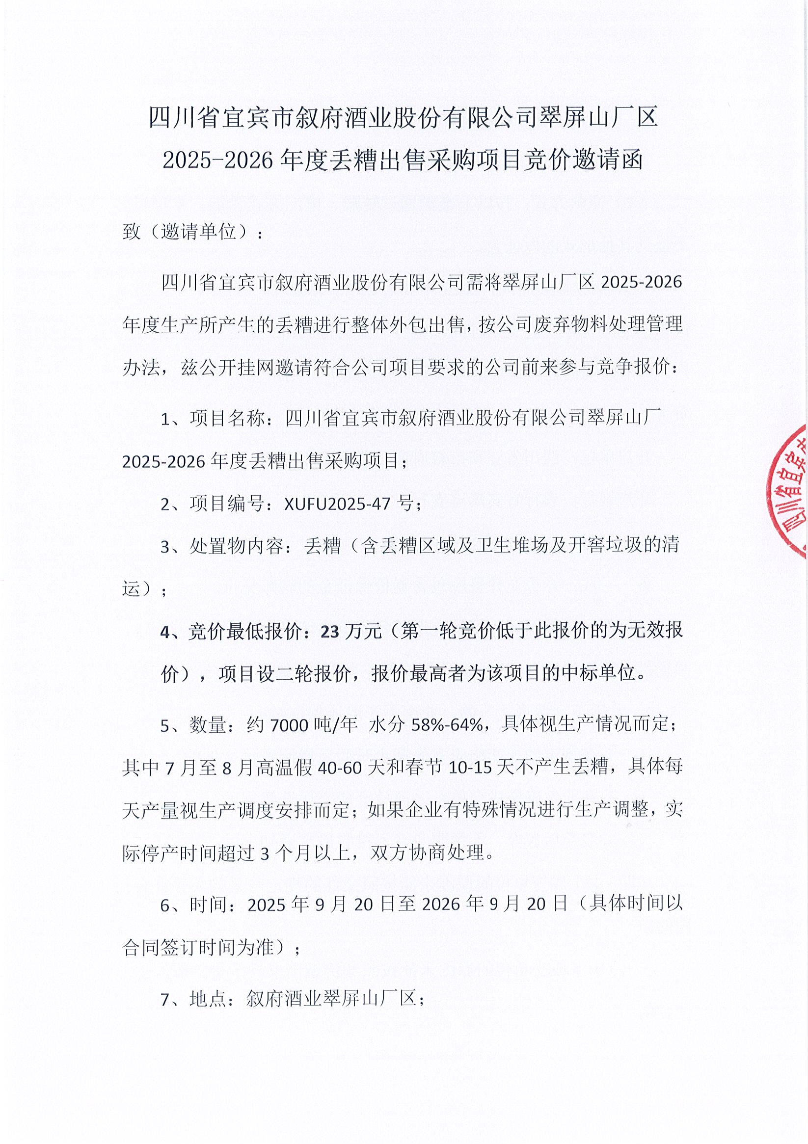 四川省宜賓市敘府酒業(yè)股份有限公司翠屏山廠2025-2026年度丟糟出售采購項目競價公告