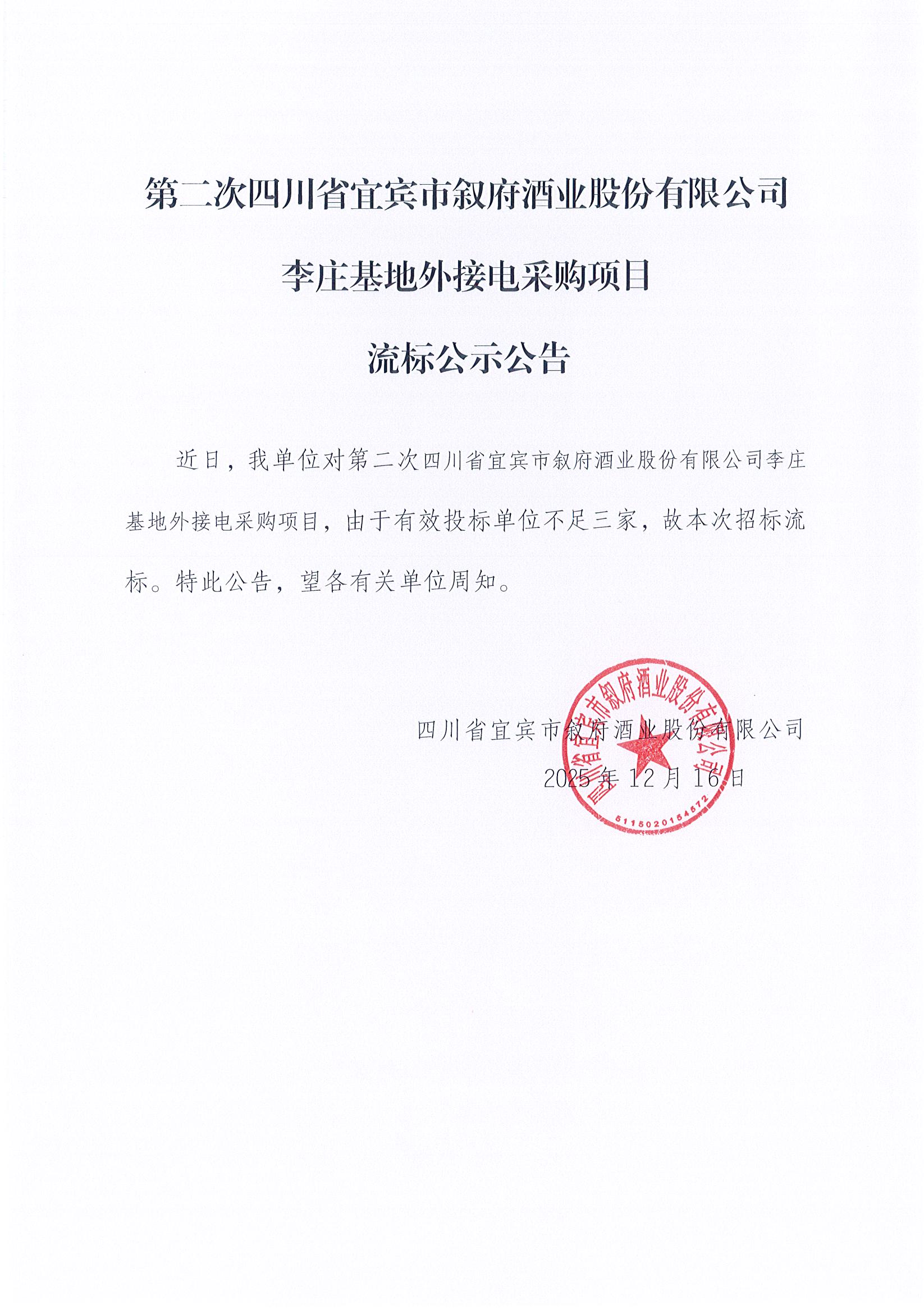 第二次四川省宜賓市敘府酒業(yè)股份有限公司李莊基地外接電采購項目流標公示公告