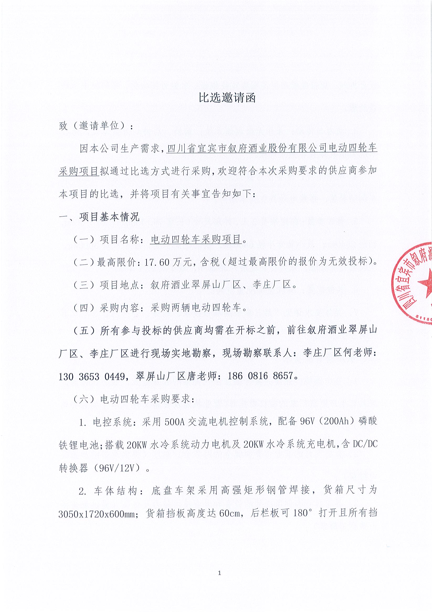 四川省宜賓市敘府酒業(yè)股份有限公司電動四輪車采購項目比選招標公告