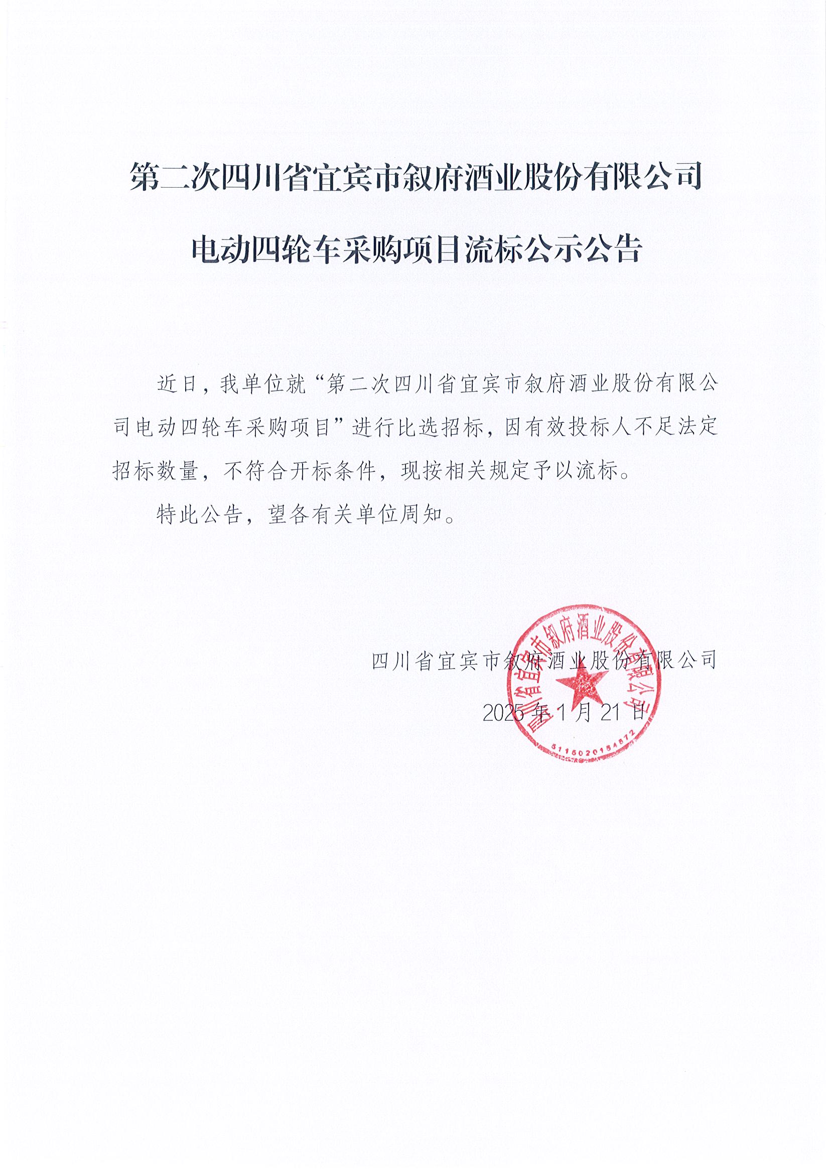 四川省宜賓市敘府酒業(yè)股份有限公司電動四輪車采購項目流標公示公告