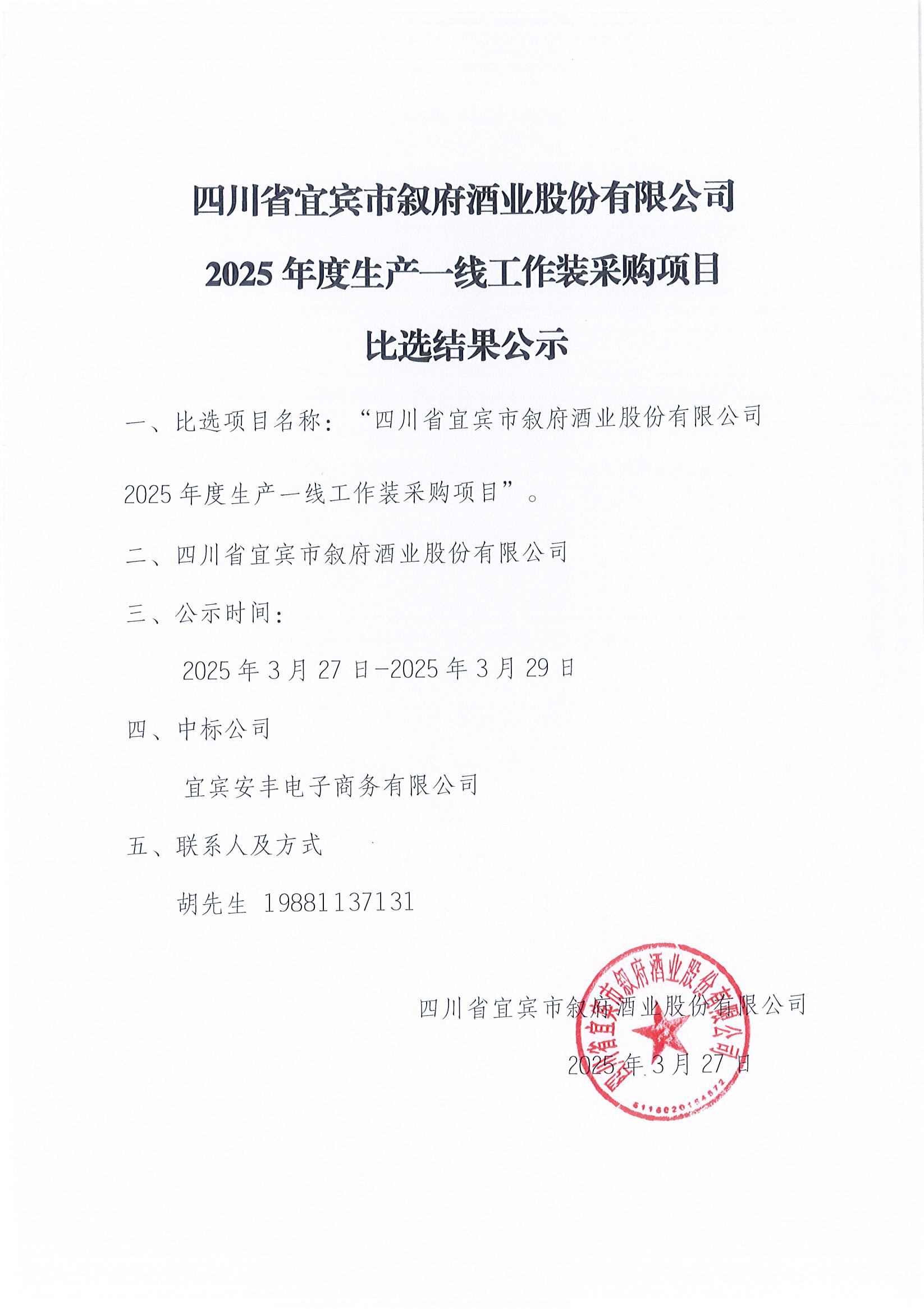 四川省宜賓市敘府酒業(yè)股份有限公司2025年度生產(chǎn)一線工作裝采購(gòu)項(xiàng)目比選結(jié)果公示