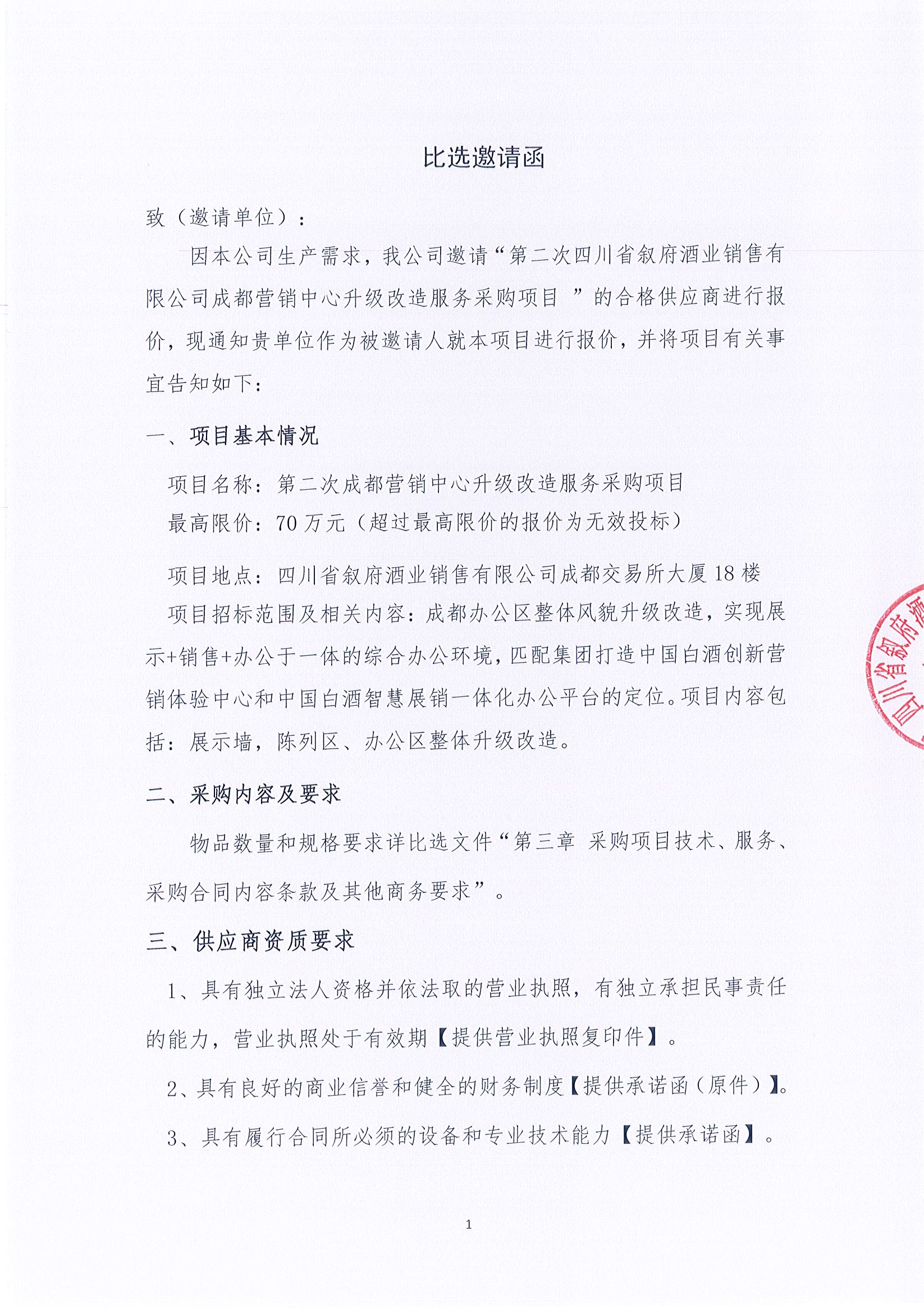 第二次四川省敘府酒業(yè)銷售有限公司成都營銷中心升級(jí)改造服務(wù)采購項(xiàng)目公開比選招標(biāo)公告