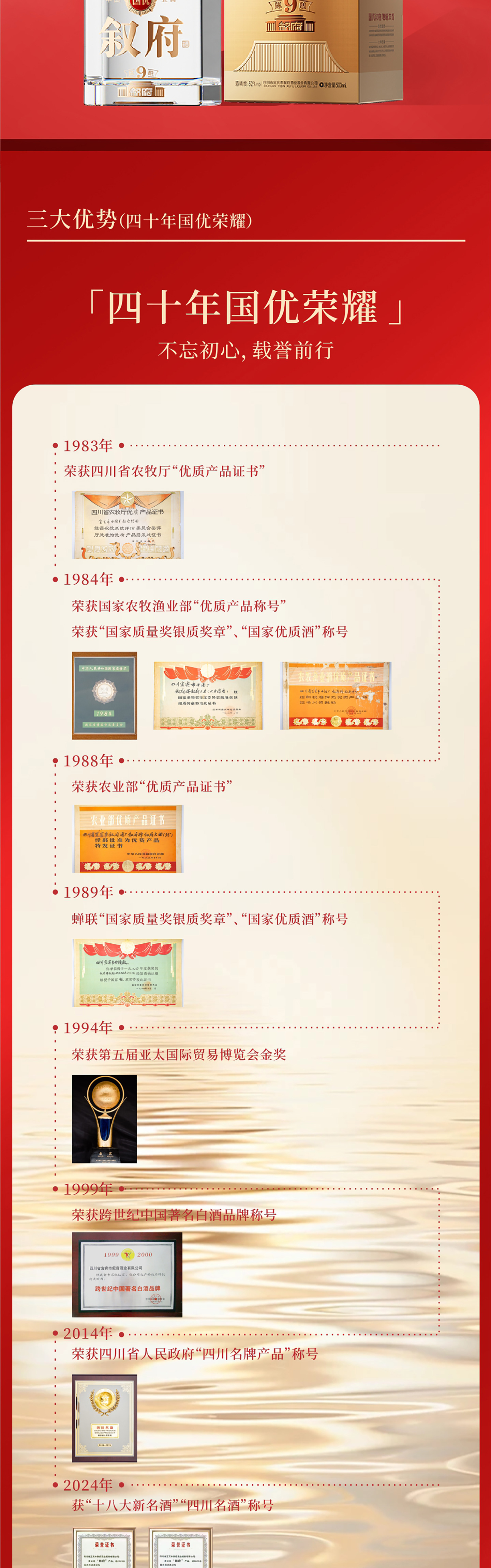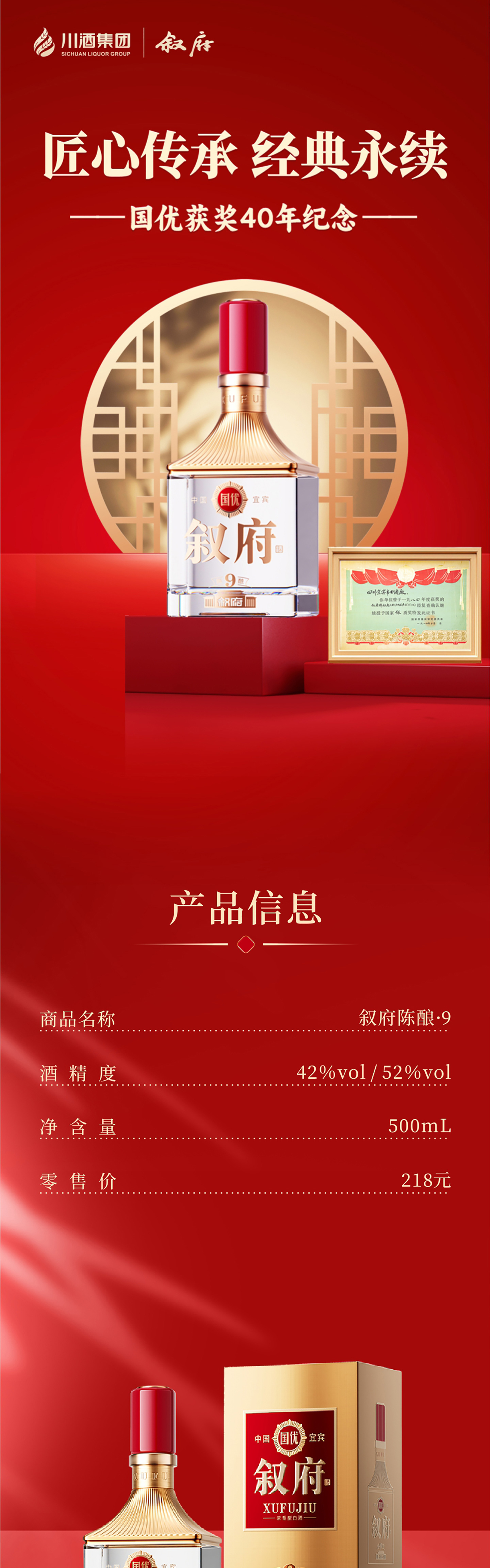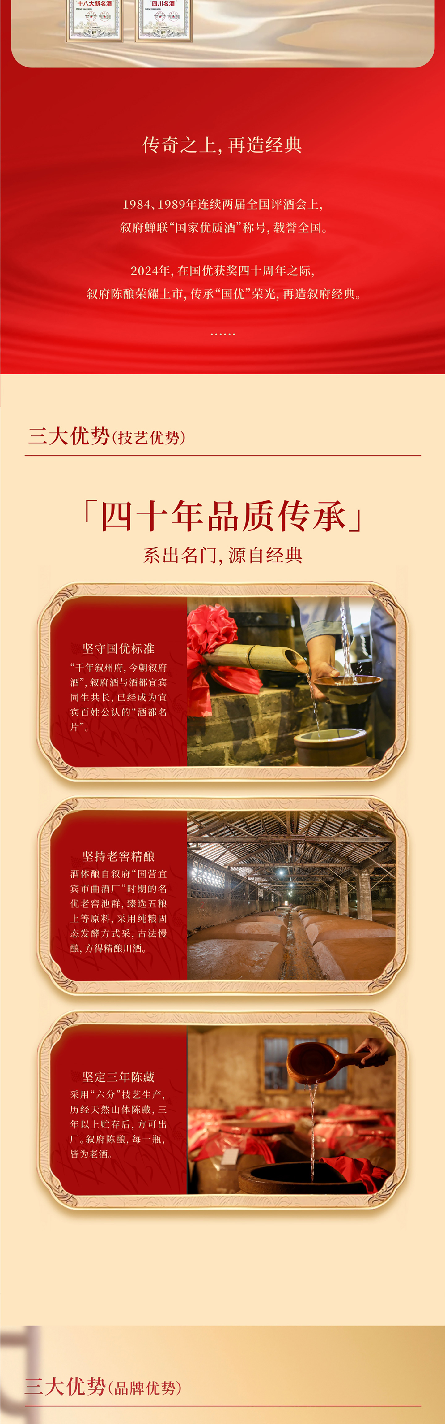 敘府陳釀,以四十年歲月堅守,融合“名優(yōu)產(chǎn)區(qū)、精釀技藝、歲月老窖,國優(yōu)品質(zhì)”,用匠心雕琢40年時光累積的豐滿,銘刻40年國優(yōu)榮耀傳承的印記