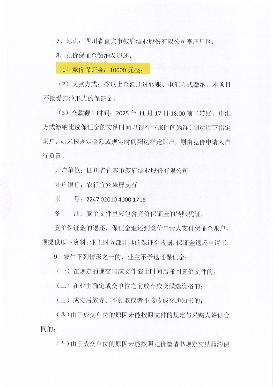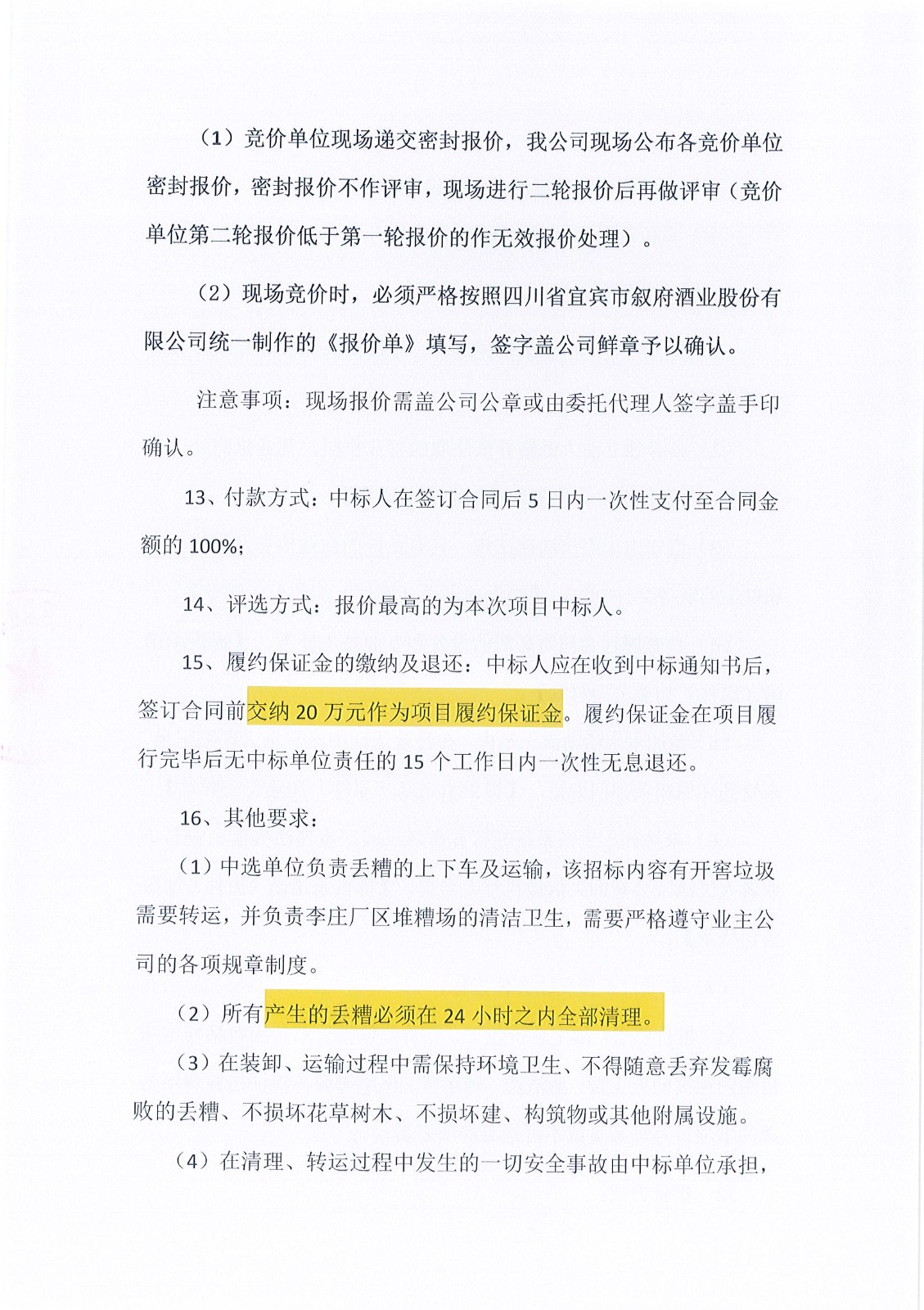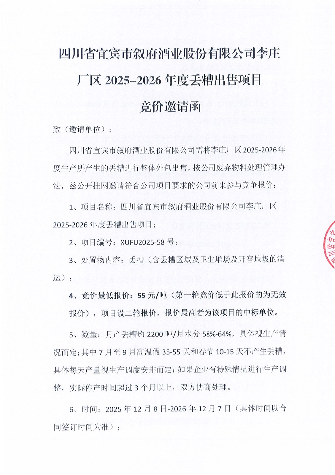 四川省宜賓市敘府酒業(yè)股份有限公司李莊廠區(qū)2025-2026年度丟糟出售項目競價邀請函