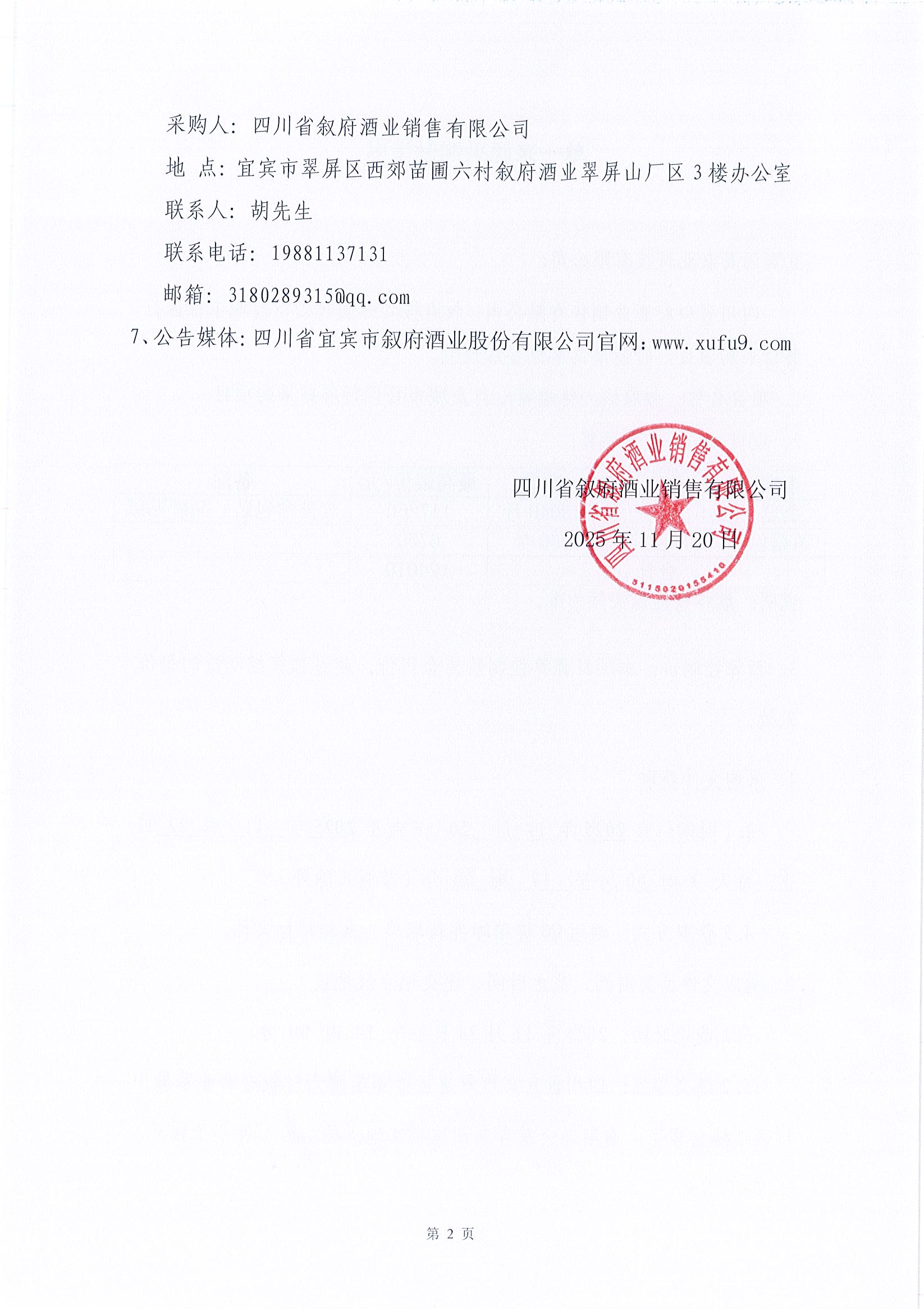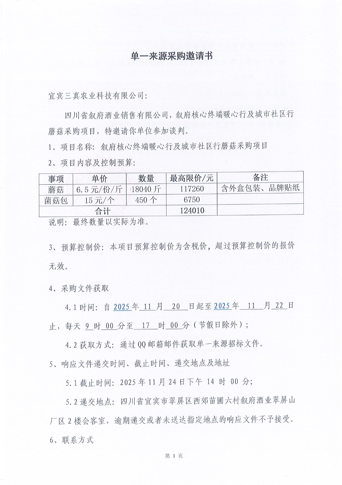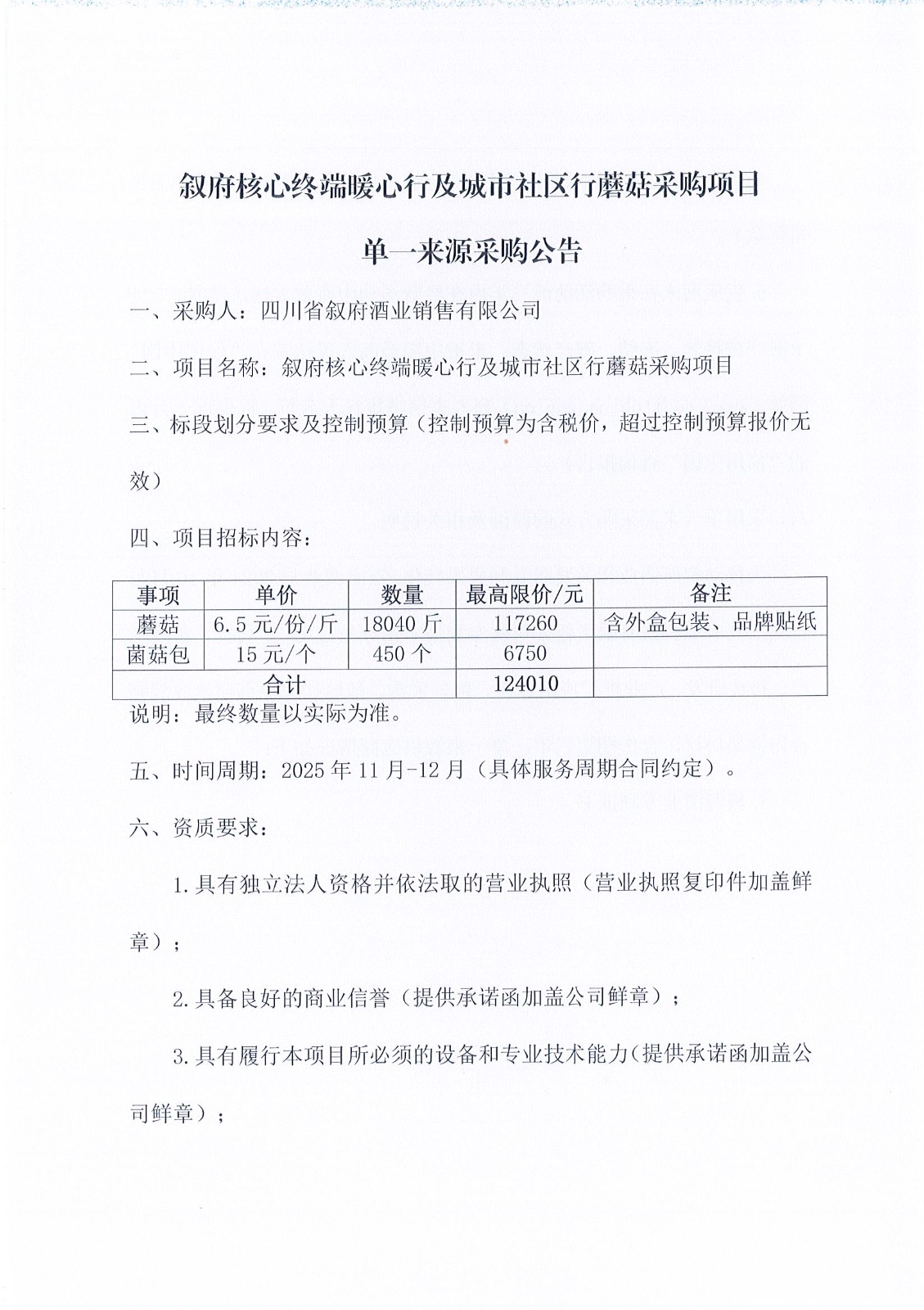 四川省敘府酒業(yè)銷售有限公司敘府核心終端暖心行及城市社區(qū)行蘑菇采購項目