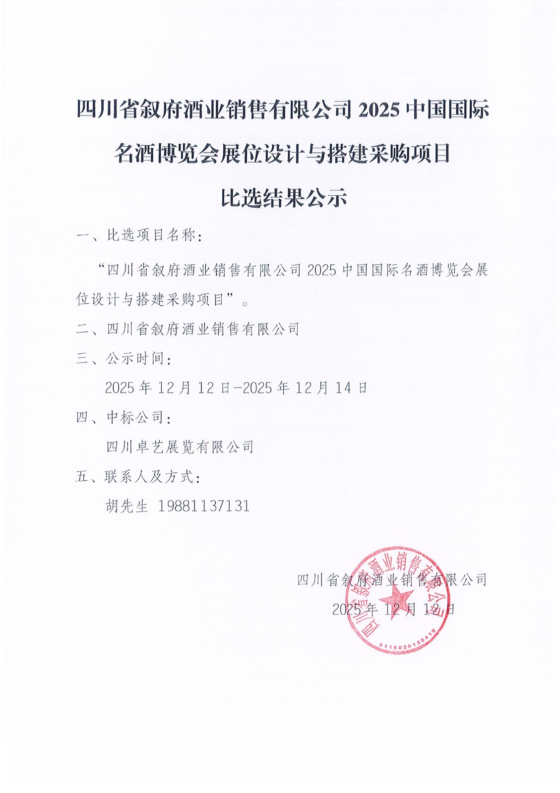 四川省敘府酒業(yè)銷售有限公司敘府大曲(藍(lán)標(biāo))產(chǎn)品TVC的創(chuàng)作與拍攝采購項(xiàng)目中標(biāo)結(jié)果公示公告